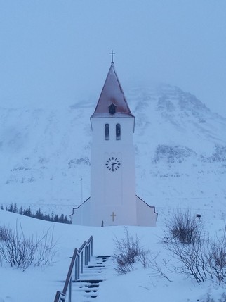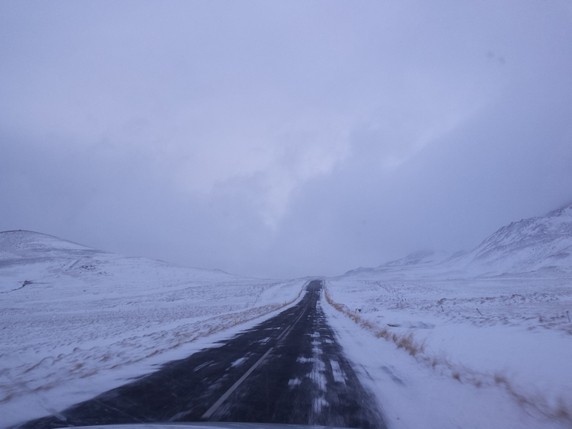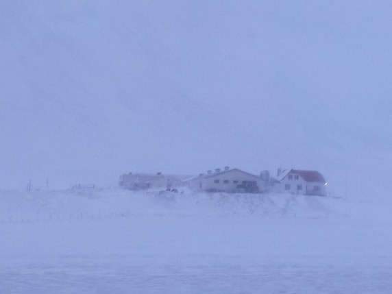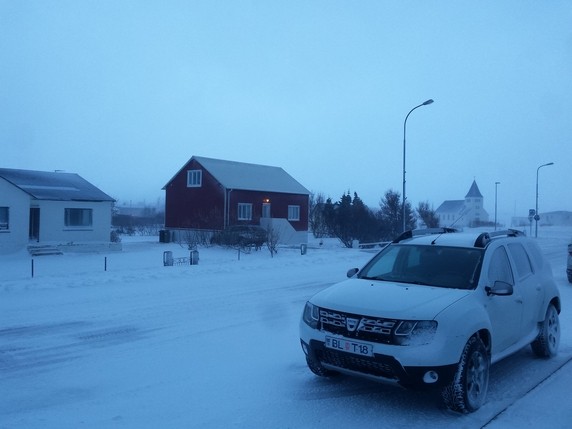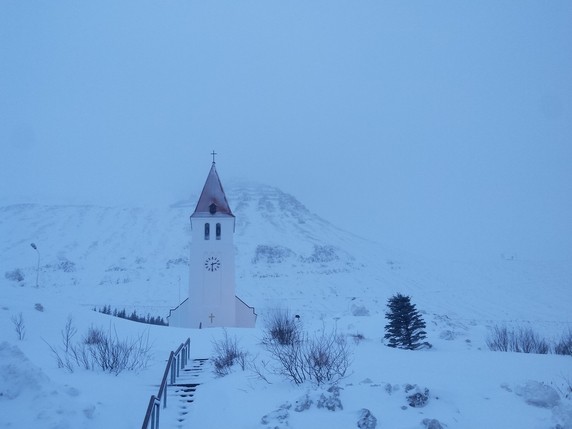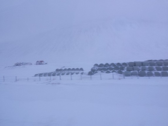Desde Hofsos salimos dirección norte por la carretera 76, la intención es bordear la costa, parando en los pueblos que nos vayamos encontrando y disfrutando del paisaje, antes de parar en Akureyri a dormir. Al poco de salir empieza a bajar la niebla, sube la intensidad del viento y empieza a nevar. El tema se complica en un puerto de montaña unos 10 km antes de llegar a Siglufjörður. El viento levanta la nieva blanda depositada en el asfalto, y no vemos más de cinco metros. Conducimos guiados por las balizas laterales de un metro de altura, que colocadas cada 25 mts marcan los límites de la calzada, pero aun así y todo, como no alcanzamos a ver dos seguidas, pasan dos o tres segundos de angustia entre baliza y baliza en los que la carretera hay que adivinarla. Gran parte la hacemos en tercera o incluso segunda, algunos coches en dirección contraria se han parado en el lateral, su situación es peor ya que van por el lado del barranco. Nosotros seguimos, pensando que peor no puede ser, y confiados por dos motivos: llevamos un coche detrás (si pasa algo él lo verá o adivinará) y porque vamos por el lado interior del puerto. Tardamos poco más de una hora en hacer 10-15 km, no entiendo como no han cerrado esta carretera.