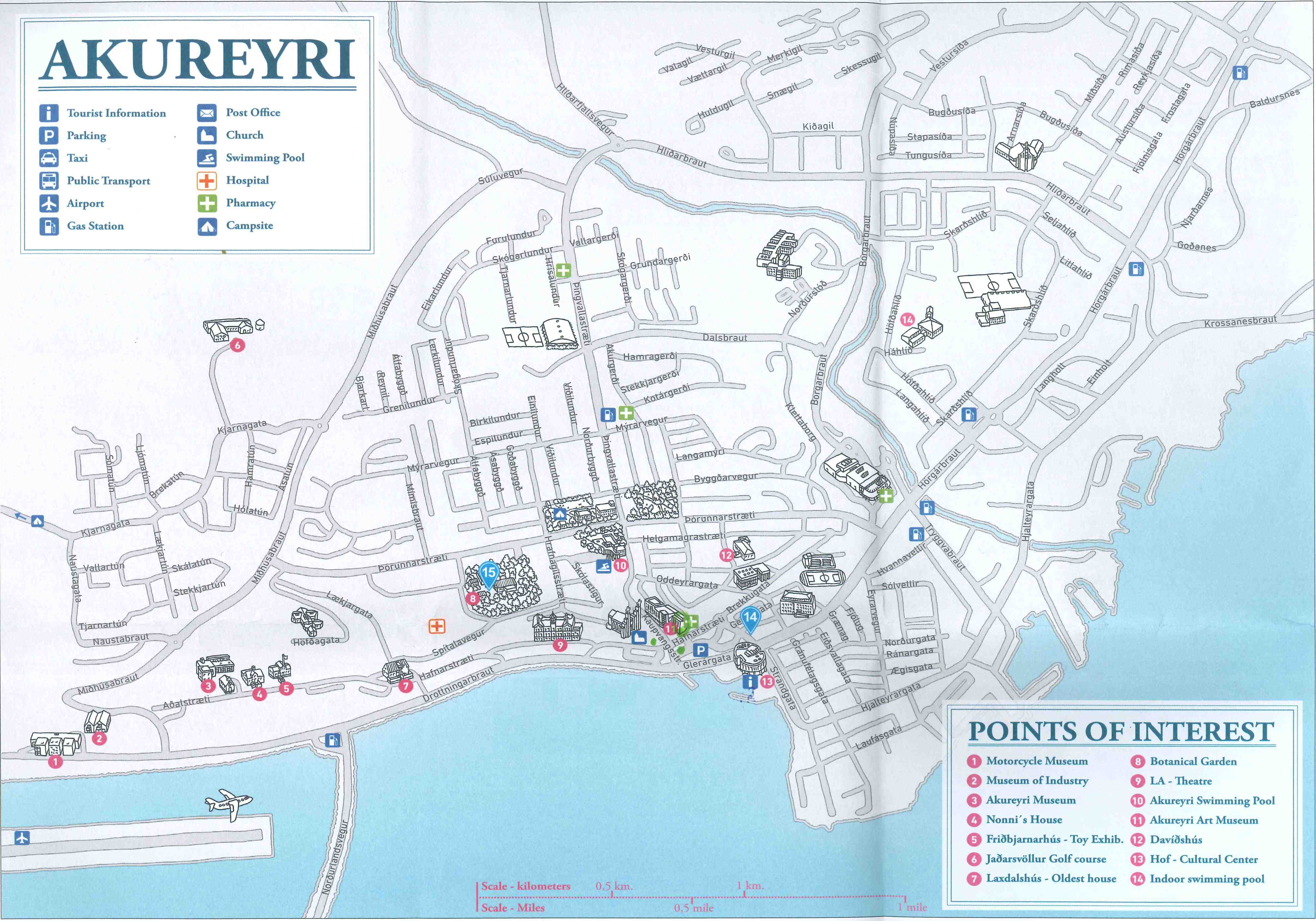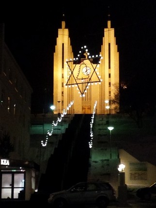 Akureyri ha sido un importante puerto pesquero y comercial a lo largo de toda su historia, y durante el último siglo su población se ha multiplicado casi por nueve, siendo hoy la cuarta ciudad más grande del país con 18.000 habitantes. Está situada en la base del fiordo Eyjafjörður y rodeada de altas montañas, lo que le confiere un clima relativamente cálido para su latitud, por primera vez en todo el viaje no hace viento y podemos pasear. A las 18h ha cerrado todo, pero aun así y todo estamos un par de horas deambulando.