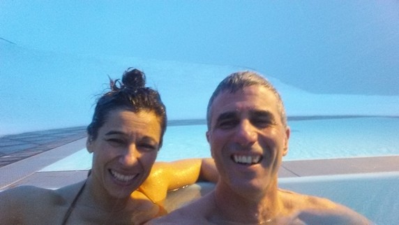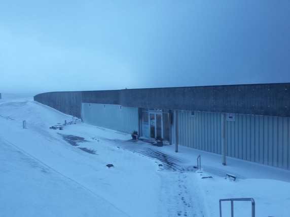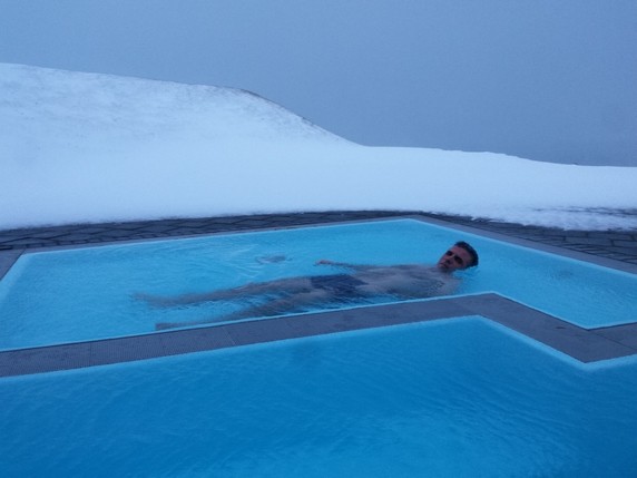 Cuando miras hacia el fiordo la nieve traída por el fuerte viento te golpea en la cara. Toda la piscina está rodeada de un manto blanco. Tras un rato con la cabeza fuera del agua, en el pelo mojado se crean pequeños trozos de hielo. Poco a poco empieza a amanecer, aunque aquí el sol casi nunca aparece del todo, ha dejado de nevar y la luz diurna nos deja ver el fiordo. Disfrutamos de una sesión de relax contemplativo hasta las 12 del mediodía.