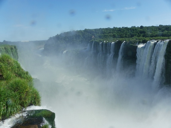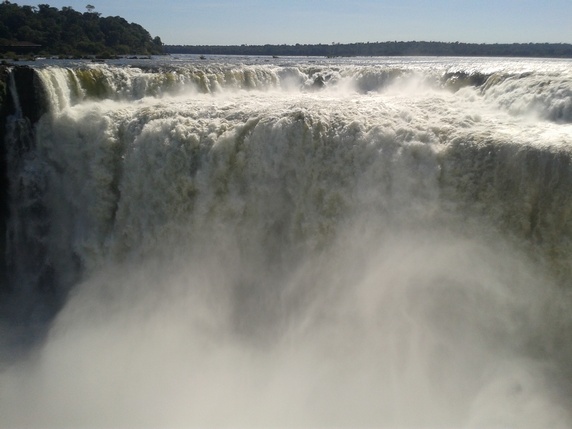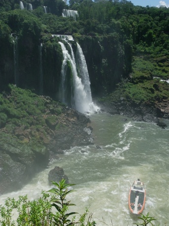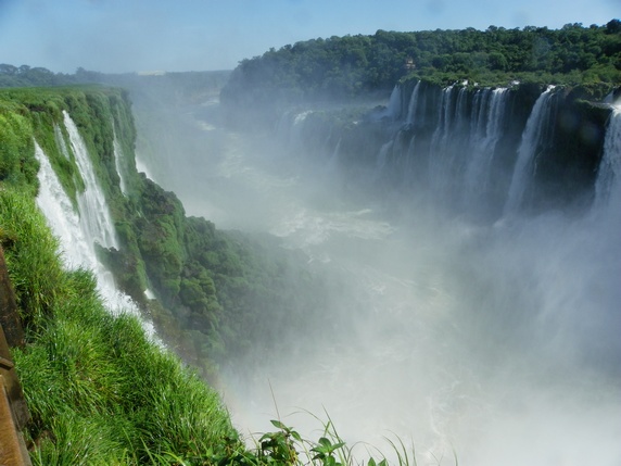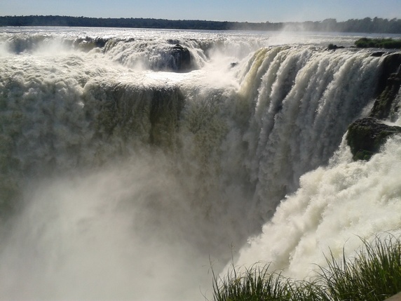 Garganta del Diablo, ya que se encuentra completamente desprotegida de árboles y sombra. Hasta ella lleva una larga pasarela que zigzaguea atravesando un ancho tramo del río donde es fácil ver gran variedad de animales y plantas. Desde el mirador la garganta se ve desde arriba. Las aguas que vienen del tranquilo río Iguazú se precipitan enérgicamente por un acantilado de 80 mts, entre un fuerte estruendo y nubes de vapor de agua. No es una vista panorámica como en Brasil, cuya pasarela se ve en frente, pero se siente mas la potencia de esos miles de litros de agua cayendo con fuerza al vacío.