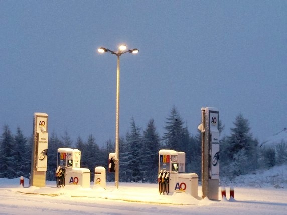 gasolinera, es aconsejable llevar el depósito lleno, pues hay largos tramos desabastecidos, como el que transcurre entre Mývatn y Egilsstaðir de 140 km. Hay que tener mucho cuidado con ello, a diez grados bajo cero, parado en una carretera sin arcén, con fuertes vientos levantando nieve, y a lo peor sin cobertura móvil, solo os queda apostar que os matará primero, si la congelación por no tener calefacción en el coche o la colisión de otro vehículo que no podrá veros. Poca broma. Hay gasolineras con tienda, servicio de comidas y algunas mesas, y luego están las que son solo un par de surtidores en medio de la nada. Todos los surtidores disponen de lector de tarjetas para realizar el pago, y en las gasolineras con personal suele haber un surtidor que permite el pago en ventanilla. El precio del diésel ronda las 205 ISK, unos 1,65€.
