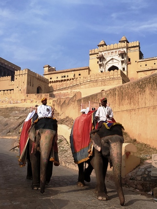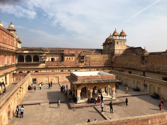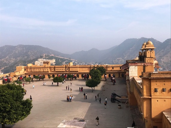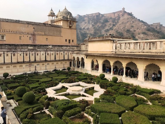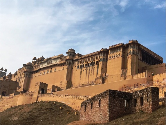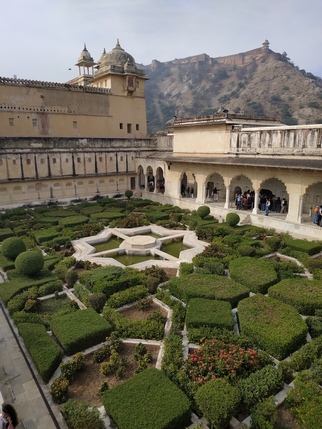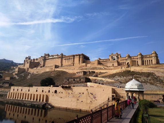Amber Fort. Construido en lo alto de una colina con vistas al lago Maota, este fuerte se remonta a la época en que Amber fue la capital del estado principesco de Jaipur, y el fuerte la residencia de sus gobernantes rajput. Su construcción se inició en 1592 y no paró de ampliarse hasta 1727 en que la capital se trasladó a Jaipur. En sus inicios fue un complejo palaciego dentro de Jaigarh Fort, situado en una colina adyacente más alta, con el que está unido a través de pasajes fortificados.