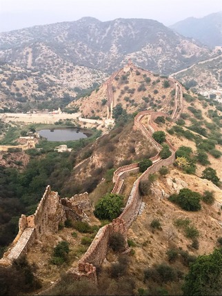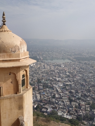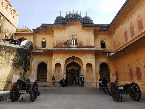acceso 200 INR), una fortaleza enorme. Sus anchos muros de arenisca roja miden 3km de largo por 1km de ancho, ocupando lo alto de una colina por encima del lago Maota y Amber Fort, con él que está comunicado mediante pasajes subterráneos. Construida por Jai Singh II, fue un centro de producción de artillería de los rajputs, y uno de sus principales reclamos es Jaivana, un cañón de 50 toneladas de peso que está considerado el más grande del mundo. Su interior alberga varios palacios que son un laberinto de estancias y patios donde es fácil perderse. Hay además jardines, dos templos, una armería, un museo, un buen tramo de muralla por el que pasear, y tres tanques de agua, ubicados bajo su patio central, el mayor de los cuales tiene capacidad para 22 millones de litros. No es tan espectacular como Amber, pero una hora se va rápido.
