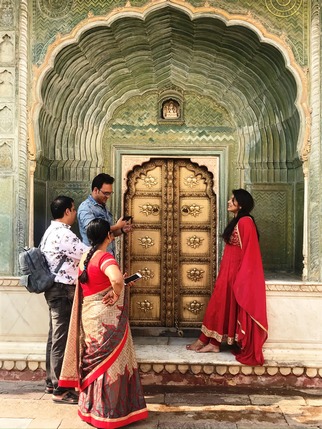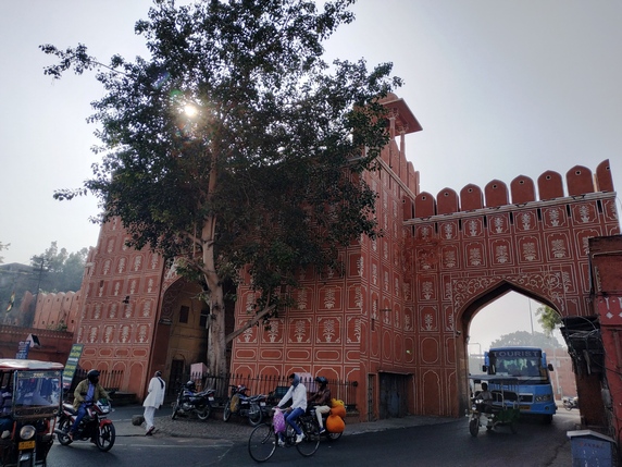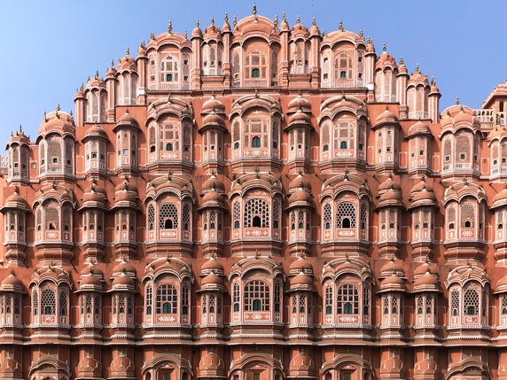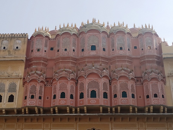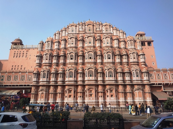 Jaipur, capital del estado del Rajastan, es una de las ciudades más fotogénicas de la India. Fundada en 1728 por el marajá Sawai Jai Singh, quien durante la época de paz y prosperidad que vino tras la derrota del último emperador mogol, trasladó aquí la corte desde la cercana Fortaleza de Amber. Fue concebida como una urbe moderna, simétrica, con un trazado racional, con grandes avenidas que separan sus cinco barrios principales, permitiendo un tráfico muy fluido para los estándares indios, aunque igual de ruidoso. Es conocida como la ciudad rosa, por su casco antiguo amurallado, donde todos sus edificios históricos fueron pintados de rosa salmón, color que representa la fortuna y la cordialidad, durante la visita del príncipe de Gales en 1905.