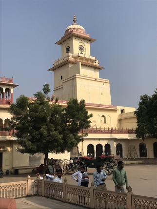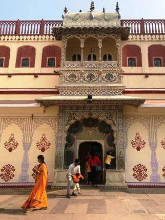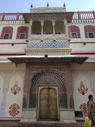 City Palace (acceso 700 INR), en realidad un inmenso recinto donde pequeños palacetes y otras edificaciones se distribuyen alrededor de patios y jardines, que era la sede del maharajá de Jaipur. Rodeado de una muralla que lo aísla del tráfico y el ruido, alberga varios museos y templos, así como centros de artesanía y souvenirs. Todo él es visitable excepto Chandra Mahal, un palacete que alberga un museo en su planta baja, pero que en su mayor parte sigue siendo la residencia de la familia del actual Maharajá de Jaipur. Una guardia de cinco hombres con turbante rojo y grandes bigotes, protege la entrada a sus dependencias. Junto al palacio se encuentra