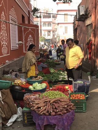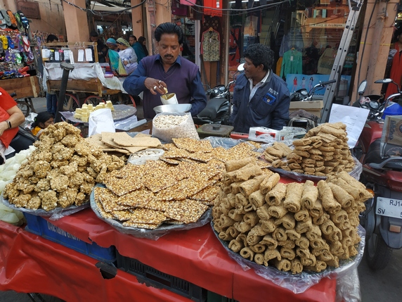Tras cruzar la puerta, a mano derecha queda el popular Bazaar Bapu, famoso por vender además de textiles, saris, artesanías diversas, brazaletes, perfumes y calzado tradicional de piel de camello. Son las once de la mañana y la mayoría de los establecimientos todavía no han abierto. El bazar acaba en Sanganeri Gate, donde girando a mano izquierda empieza Johari Bazaar, conocido por la fabricación artesanal de joyas, con piedras preciosas y semipreciosas, en particular diamantes, topacios y esmeraldas. Pasamos frente al LMB Hotel, conocido por su reputada tienda de dulces, y la mezquita Jama Masjid, engullida entre edificios, pero fácilmente reconocible por su alta fachada con arcadas y altos minaretes blancos.