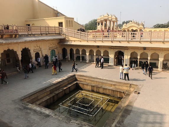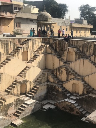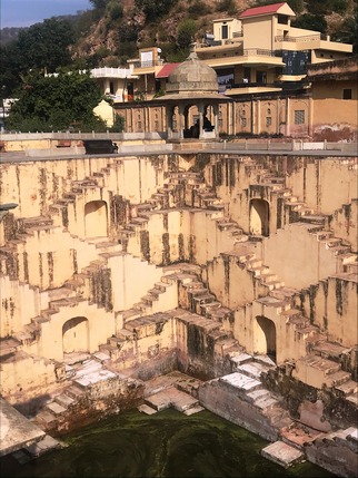 baori (cisterna escalonada) construida durante el reinado del marajá Jai Singh, en el siglo XVI. Es una cisterna escalonada de ocho niveles, cuyas escaleras tienen un patrón geométrico en zigzag, creando una hipnótica simetría que cubre sus cuatro paredes. Tanto escalón es debido a una extraña superstición que no permite subir por el mismo tramo de escaleras por el que se ha bajado, si añadimos a esto el que puedan usarlo varias mujeres a la vez, salen un montón de escaleras. Y es que estas gigantescas cisternas tienen la función de recolectar las lluvias monzónicas y preservar el agua durante los meses más secos, y están diseñadas de tal manera que las personas puedan alcanzar al agua a cualquier nivel, a medida que sube o baja en su interior. Es por ello que son un punto de encuentro para la comunidad, que las utiliza como fuente de agua, piscina, o para lavar la ropa. Imprescindible. Tras la cisterna está el