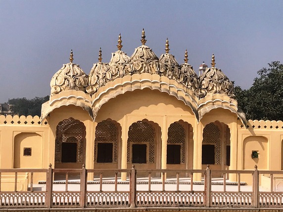 Hawa Mahal, el bello y emblemático Palacio de los Vientos, en realidad una extensión del palacio de la ciudad, cuya función era permitir a las cortesanas ver el ambiente de la calle sin ser vistas. Es por ello que su fachada principal de cinco plantas, las dos últimas algo más estrechas le dan una forma piramidal, alberga casi un millar de diminutas ventanas, por donde se puede mirar con discreción, y que permiten el paso del viento manteniendo la estancia fresca. Tras esta fachada hay un pequeño patio, que da acceso mediante rampas, no hay escaleras, a las plantas superiores y sus discretos balcones. Acceso 200 INR.