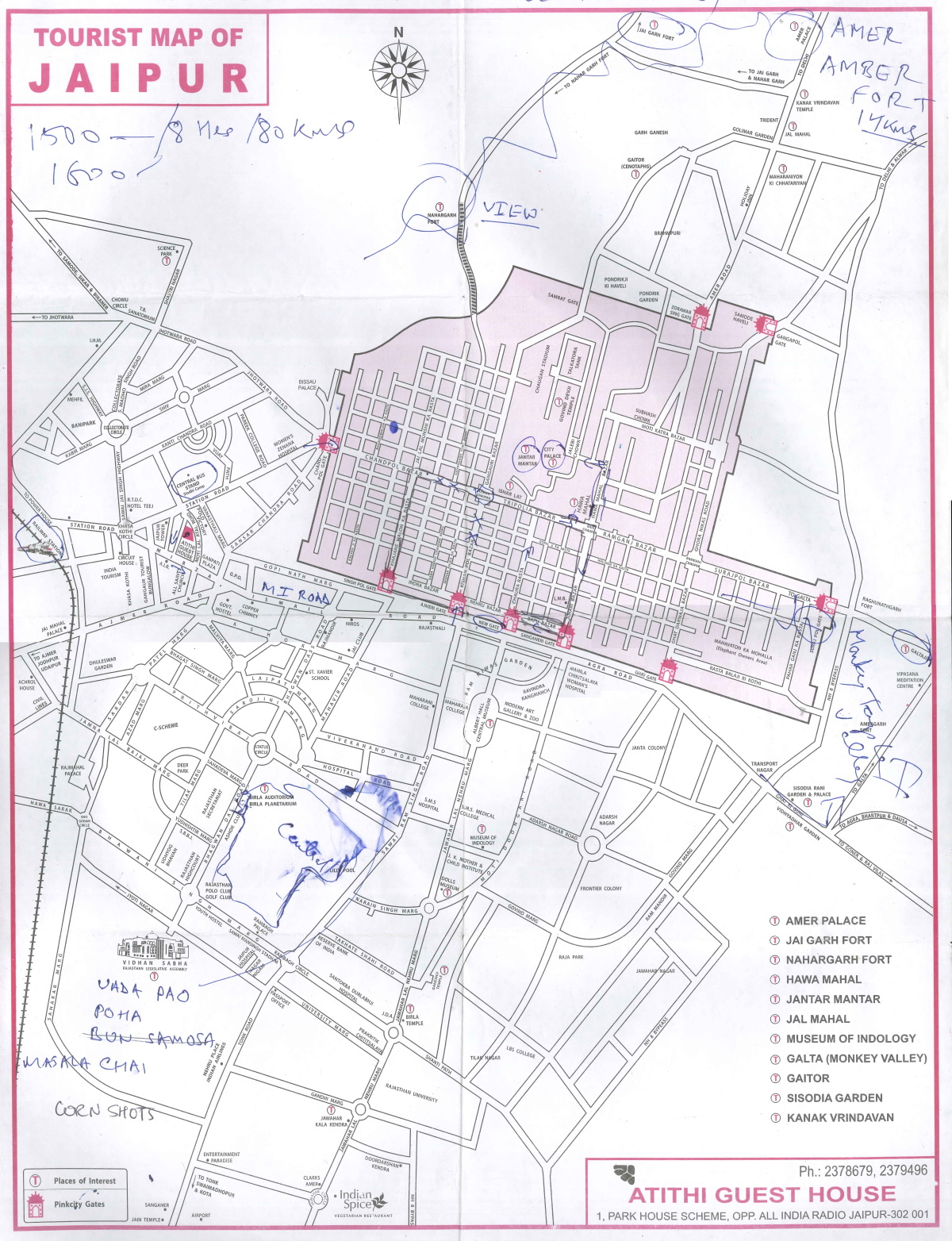 Atithi Guest House, 2.000 INR, aceptan tarjetas. Habitación doble, amplia, limpia, con baño completo, televisión, aire acondicionado y buenísima señal wifi. Personal muy amable y profesional. Dispone de una cómoda sala común con sofás y librería, y un servicio de cocina que atiende en la planta baja o la azotea. Desayuno incluido (huevos, tostadas y te o café). La relación calidad precio es insuperable, el mejor del viaje, si vuelvo a Jaipur vengo sin dudarlo. Cenamos en la terraza del hotel,