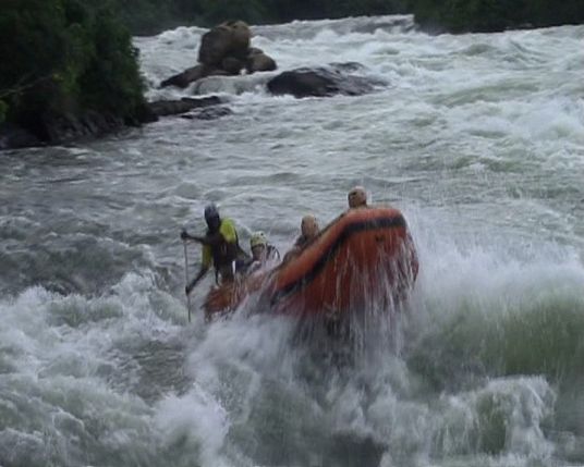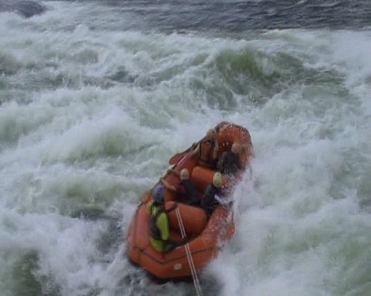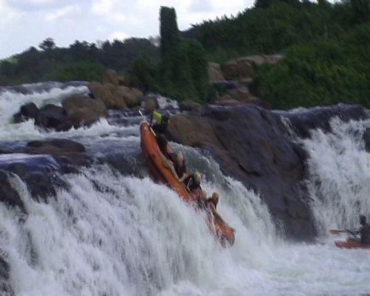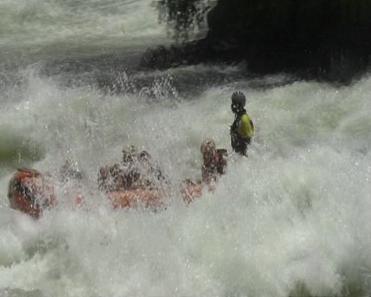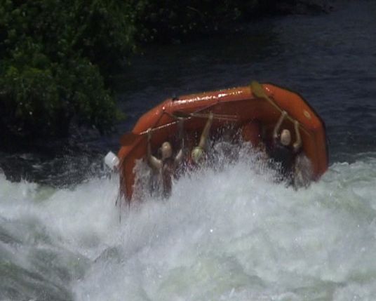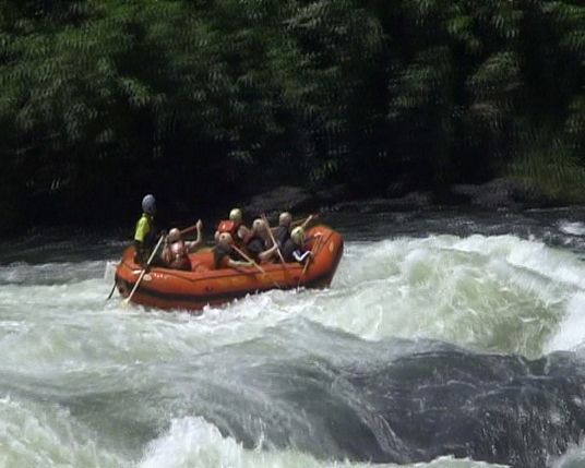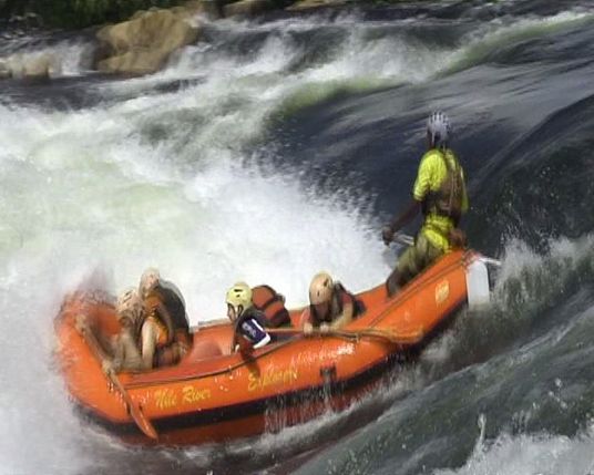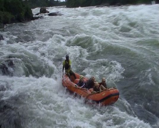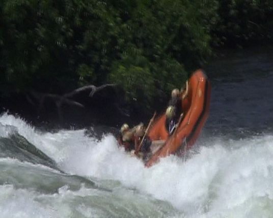 En nuestra barca somos seis turistas (nosotros, dos americanas y dos israelís), y Henry, nuestro guía-instructor. Para ir aclimatándonos y familiarizándonos con las diferentes instrucciones y técnicas, empezamos con una zona tranquila, seguida de tres rápidos menores: grado dos, grado uno y grado dos de nuevo. El siguiente rápido son las Bujigali Falls, un grado cinco. Accedemos a él pasando por delante de la terraza del campsite donde ayer estuvimos comiendo.