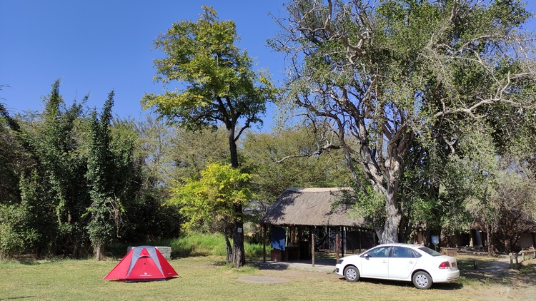 bungalows y zona de acampada junto al río, a las afueras de Kasane. Plazas de camping amplias y cómodas, con