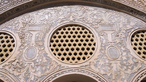 iwans, uno de ellos con una enorme cúpula flanqueada por dos minaretes, todo ello decorado con un bonito embaldosado.