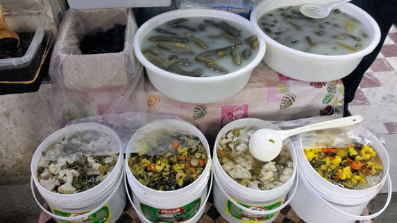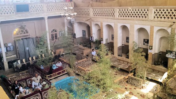 Cenamos en el hotel (300.000 IRR, 7,5€): ensalada shirazi, sopa, berenjena encurtida, gaymerizeh (estofado con patatas), yogurt, agua, té y pan. La comida esta deliciosa, y el patio y sus bancos alfombrados son un lugar muy agradable para cenar.
