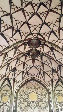 Khan-e Abbasian. Es un complejo de seis edificios en varios niveles, con sus respectivos patios diseñados para realzar, siendo cada nivel mas grande, y culminando en un patio abierto en la parte superior. Una de las estancias tiene un techo decorado con piezas de espejo, para dar la impresión de un cielo estrellado bajo el brillo nocturno de las velas. Natia trabaja aquí y nos guía durante la visita. Nos invitan a un sorbete de agua de azafrán, al entrar y otro de menta al salir, en el fantástico bar-restaurante.
