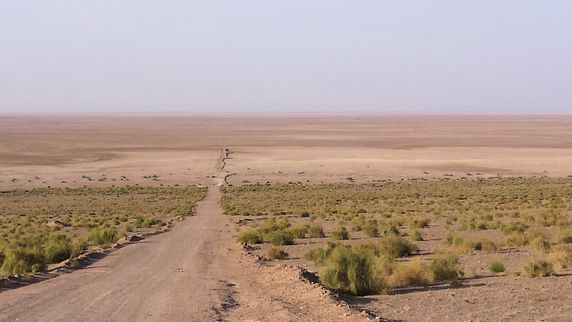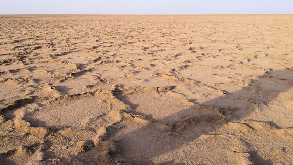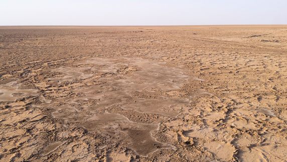 Darya-ye Namak, un pequeño lago salado a 50 km de Kashan. Aquí no hay ningún tipo de vida animal o vegetal, tan solo una inmensa planicie agrietada, formada por las placas de sal, que se pierde en el horizonte. Es un paisaje de belleza desgarrada, cruel y relajante a la vez.