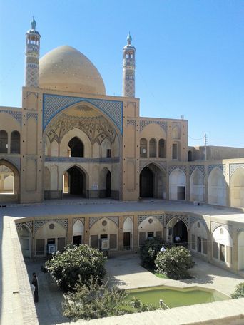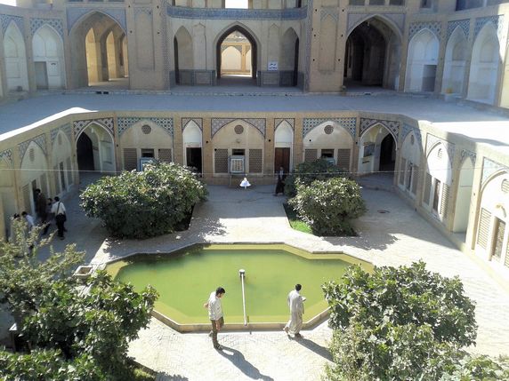 Masjed-e Agha Bozorg, una mezquita y madraza de finales del siglo XVIII. Es una construcción peculiar. El patio tiene un corte en medio, creando un nivel inferior, donde hay un jardín con árboles y una fuente. En el nivel superior hay dos