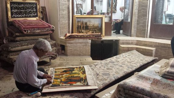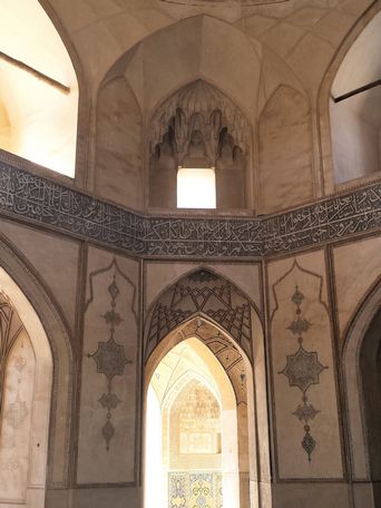 Visitamos la Mezquita Mir Emad, construida a finales del siglo IX, que se encuentra al sur del bazar de cobre, y nos detuvimos en Khan Amir al Dowleh Timche, un caravasar de 1868 con una altísima cúpula. Además de unas cuantas tiendas de alfombras, donde podremos ver como las confeccionan a mano; en la entrada hay un pequeña tetería desde donde disfrutar de la espectacular decoración del lugar. Otro lugar popular donde tomar el té es el Hammam-e Khan (XIX), pero estaba cerrado.