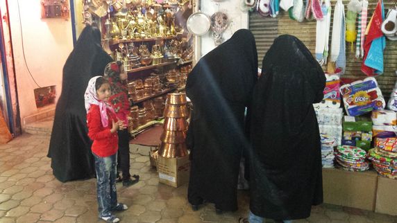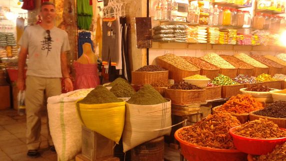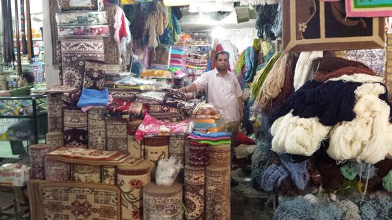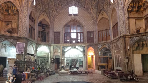 18:00 Volviendo de Natanz, Abbas, nos deja en la puerta del bazar. Es el más activo y animado que hemos visto hasta ahora. Poco espacio libre queda en su largo pasillo principal, una estructura de adobe con arcadas y altos techos abovedados, donde se suceden tiendas y pequeños bazares especializados. Aquí se puede comprar prácticamente todo: alfombras, ropa, herramientas, menaje del hogar, material escolar, frutas y verduras frescas, especias... Nada que quiera comprar un turista. El interés para nosotros, además del placer que produce callejear en un bazar, se encuentra en todas su joyas arquitectónicas, hay varias mezquitas, tumbas, caravasares, galerías, hammams o depósitos de agua, cada uno de ellos de una época diferente.