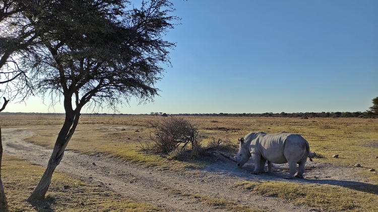 Hoy toca conducir cuatro horas hasta un santuario de rinocerontes situado a mitad de camino entre Gaborone y Maun. Pensando en parar de tanto en tanto para desentumecer las piernas, nuestra primera opción es Matsieng Rock Carvings, una serie de más de 100 petroglifos grabados en roca, de entre 3.000 y 10.000 años, que tienen una gran relevancia local, ya que según la leyenda las huellas y grabados pertenecen a Matsieng, uno de los primeros antepasados tswana, que salió de un agujero seguido de animales salvajes y domésticos para habitar la tierra. Tras 45 minutos por la carretera que lleva a Francistown, encontramos un cartel que indica el lugar. Le sigue un camino de arena sin ningún tipo de señalización. Tras adentrarnos unos centenares de metros, encontramos una docena de chozas que forman un poblado, tras el que sigue el camino. Cada vez hay más arena. Sin un 4x4, nuestro coche es un VW Polo, no nos atrevemos a adentrarnos mucho mas, por miedo a quedar varados. Así que volvemos al asfalto y seguimos conduciendo hasta llegar a Palapye, donde paramos en el Junction Shopping Mall, la primera opción real donde comer algo y poner gasolina.