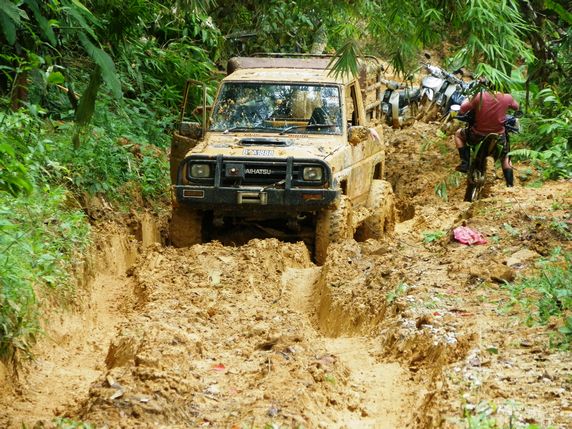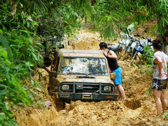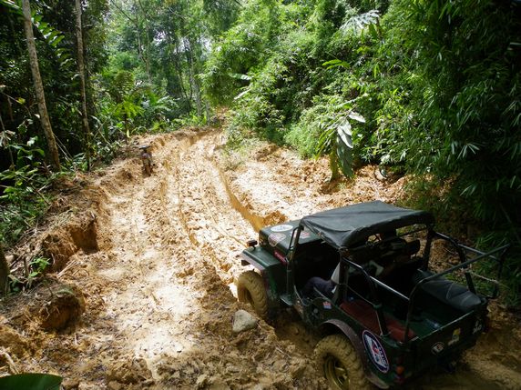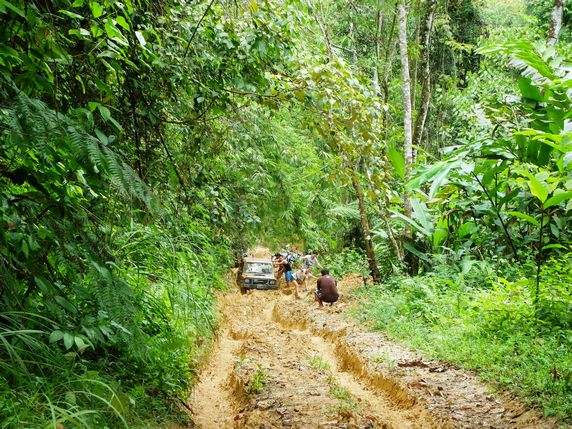 Conuntry View Adventure haremos el resto del viaje. Montados en la parte trasera de un willy nos adentramos en la selva. El camino es estrecho y empinado, ramas de palmera y grandes hojas nos golpean y entran en el vehículo de tanto en tanto. La pista varía entre encharcada y fangosa, y agrietada e irregular por las roderas que forman las lluvias diarias. El coche necesita reductoras en mas de una ocasión, y no siempre estoy seguro de que no vayamos a volcar. En esas estamos unos 45 minutos hasta llegar a la cascada de