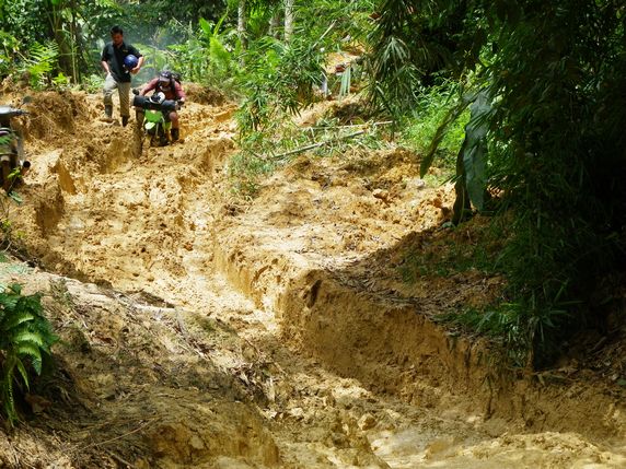Lata Berembun, una bonita zona de picnic y baños. Al menos una veintena de personas están allí pasando el día. Mas de uno ha tenido que dejar la moto en el borde del camino, ya que los últimos metros son casi intransitables.