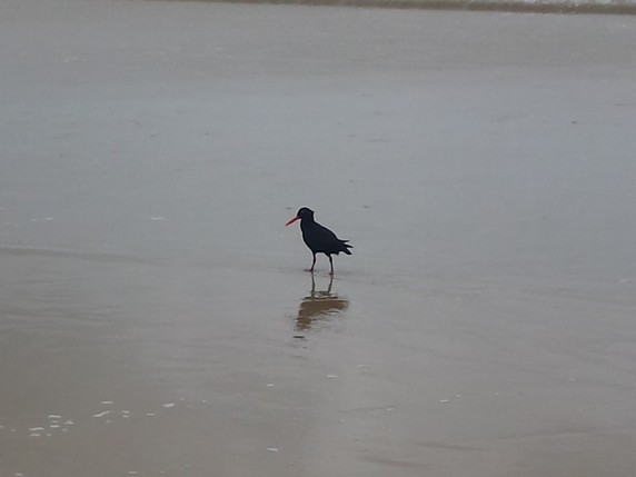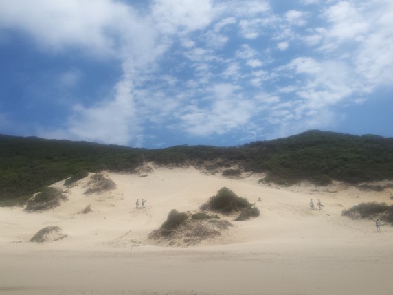 Se tarda entre 1h15 y 1h30 en llegar al otro lado de la bahía. Es un recorrido fantástico y poco transitado, apenas nos cruzamos 20 personas y eso que estamos en temporada alta. Hay poco que explicar, a un lado el océano, al otro dunas de 15 a 20 metros cubiertas de vegetación en su mayor parte. En algunas zonas libres de plantas hay quien se lanza ladera abajo con pequeñas tablas de snow, los hay tan profesionales que incluso llevan las botas ancladas. Se ven muchas gaviotas y african black oyster-catcher, unos pájaros negros de pico naranja que suelen ir en parejas. Pero el animal omnipresente son unas caracolas con cuerpo de babosa que emergen de la arena en cuanto se retira la espuma de la ola, se pueden contar por centenares en ocasiones. Sudáfrica es un país con mucha afición a la pesca, justo cuando pasamos un chico está recogiendo el sedal de una caña que está claramente curvada, algo lleva, y pesará algún kilo que otro. Se trata de un pequeño tiburón de algo más de medio metro, que devuelve al agua tan pronto como le consigue sacar el anzuelo. Este no da miedo, pero tal vez la madre no ande lejos...