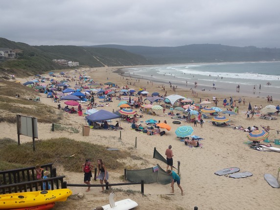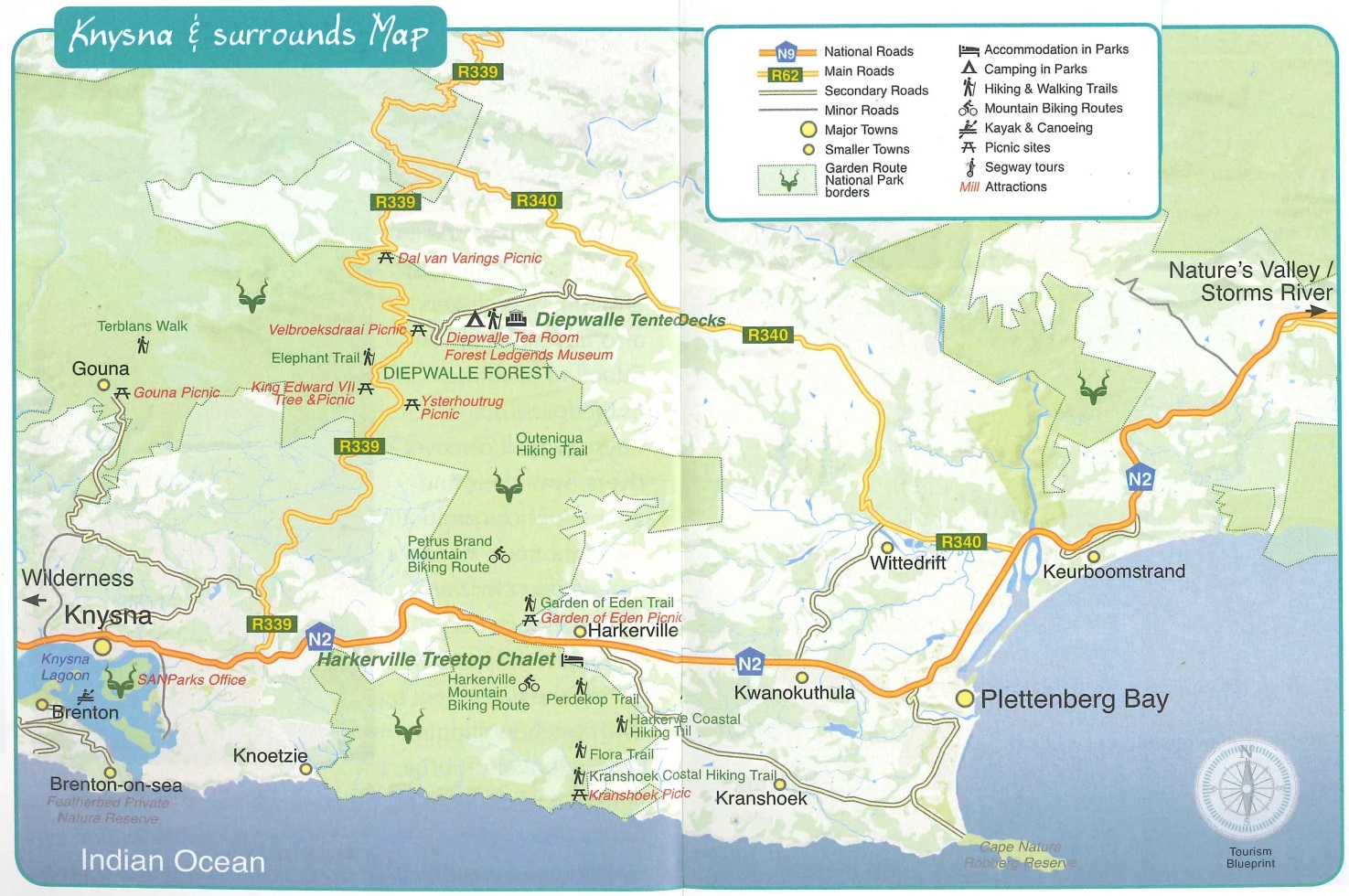 Knysna Section. La característica más destacada del paisaje en esta sección es el estuario, Knysna Lagoon, rodeado de bosques y abierto al mar. La ciudad está construida sobre una de sus orillas, y además de las muchas opciones que ofrece su privilegiado entorno natural, es un lugar muy valorado por los amantes del golf y las ostras. A ambos lados de la Main Road, hay restaurantes, hoteles, pubs, tiendas y supermercados. Con un turismo mayoritariamente blanco, es el lugar más pijo que vimos en Sudáfrica.