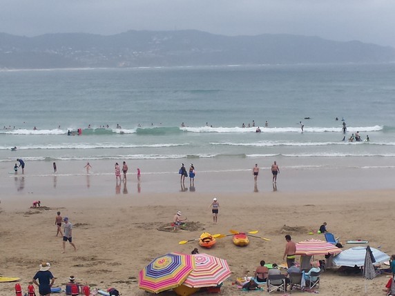 Buffalo Bay la playa está llena de gente, dentro y fuera del agua. Surf,