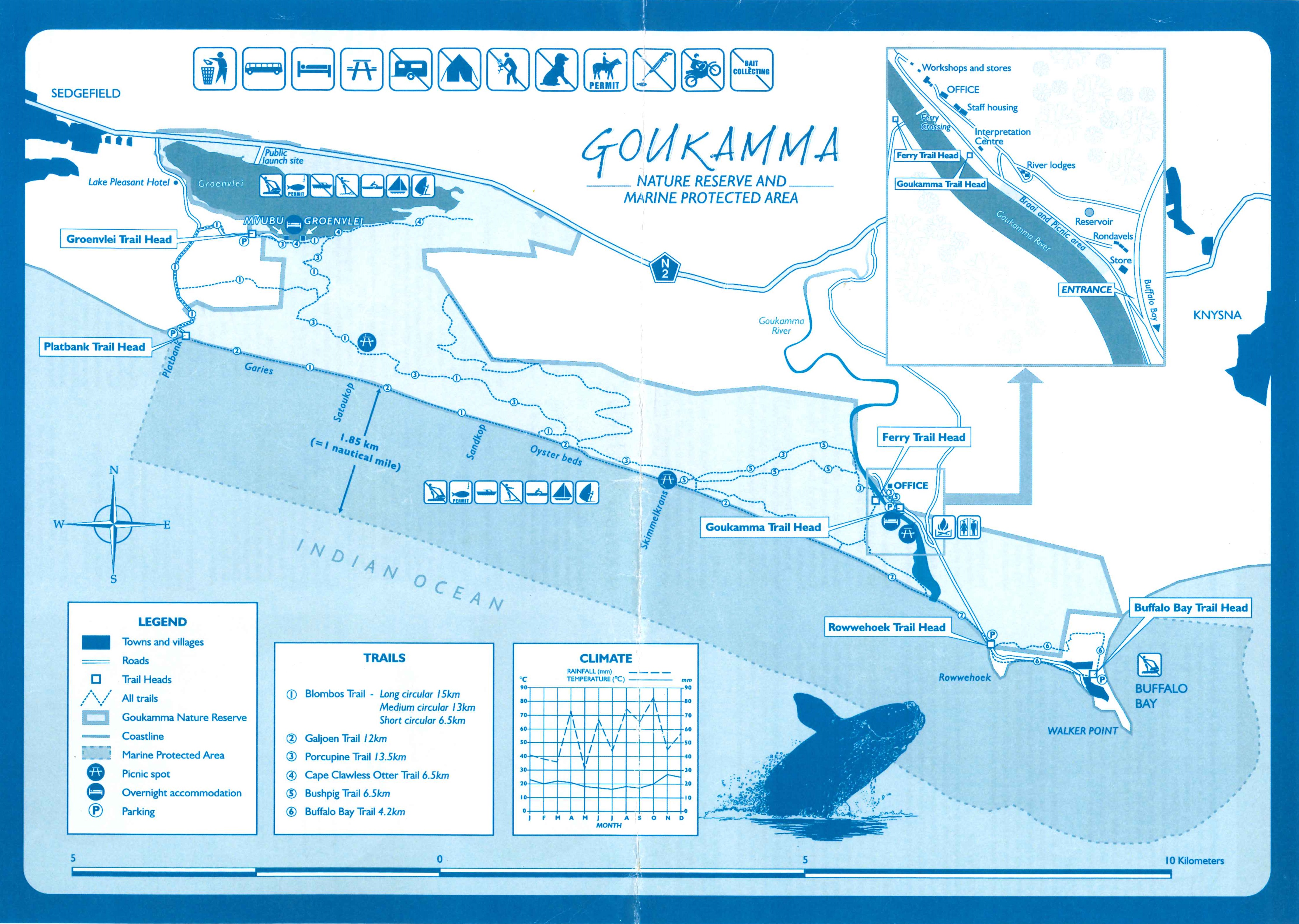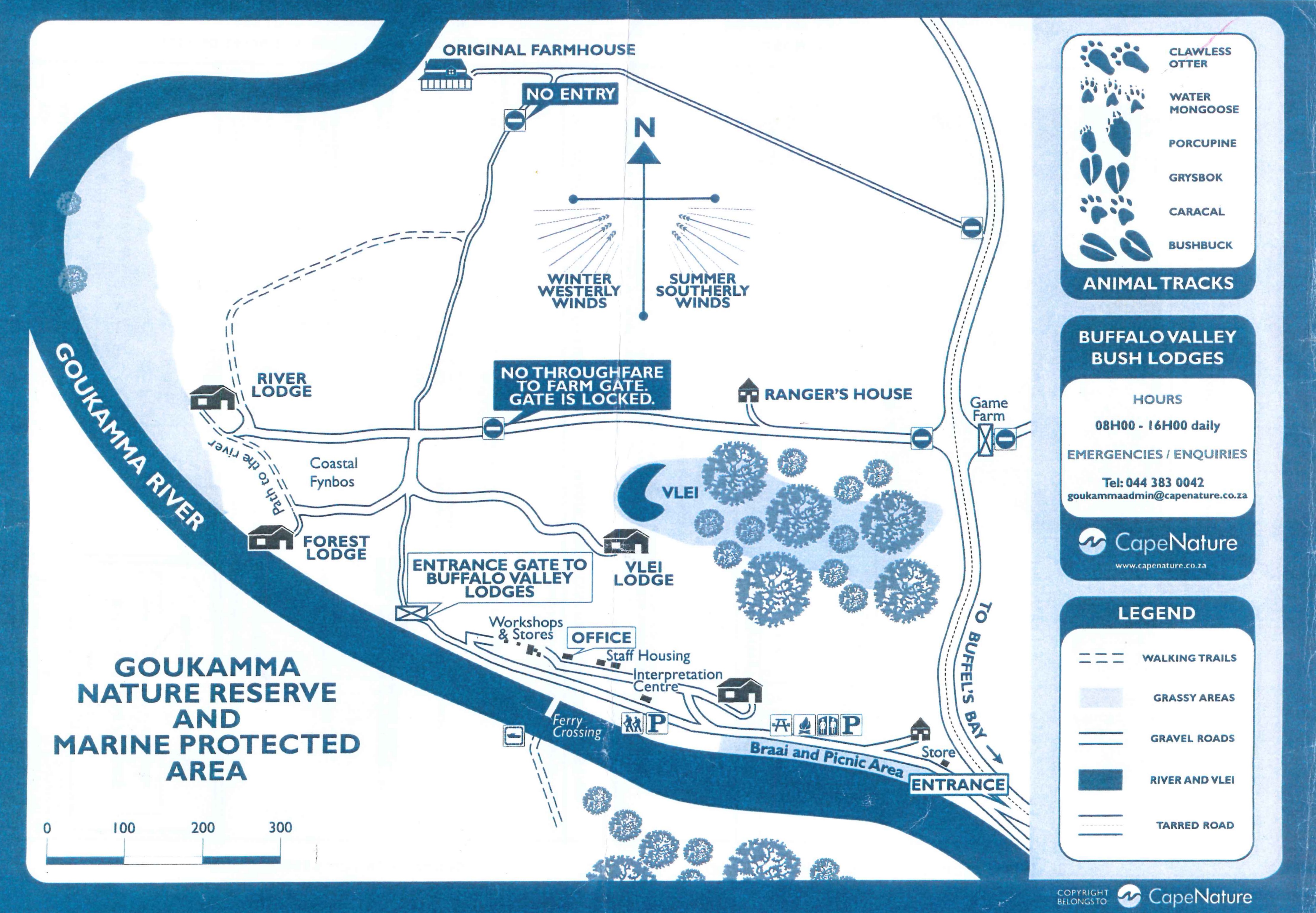 Tras la oficina de acceso a la reserva hay una larga zona verde de picnic, con lavabos y barbacoas, junto al río Goukamma. Allí están también las oficinas centrales y algunos