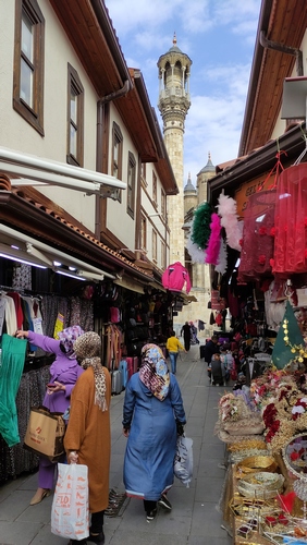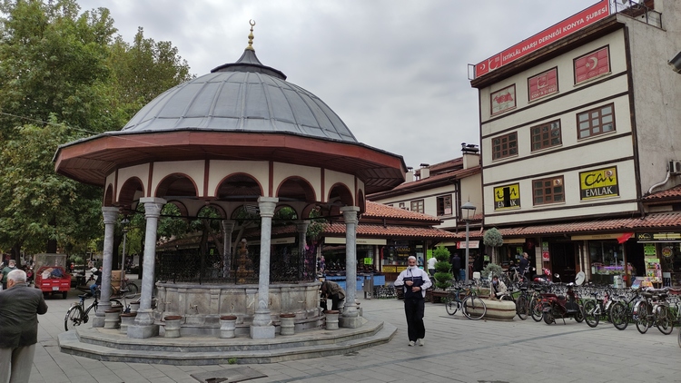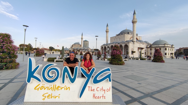 Konya tiene fama de ser una de las ciudades más religiosas y conservadoras del país. A nosotros no nos lo pareció. Bien al contrario, nos pareció una ciudad abierta y acogedora, con un centro urbano peatonal muy agradable para pasear: mercados, bazares, restaurantes, muchas mezquitas y una variada actividad cultural. Mientras estuvimos allí se celebraba un festival de música religiosa, al que seguiría otro de gastronomía la semana siguiente. En el