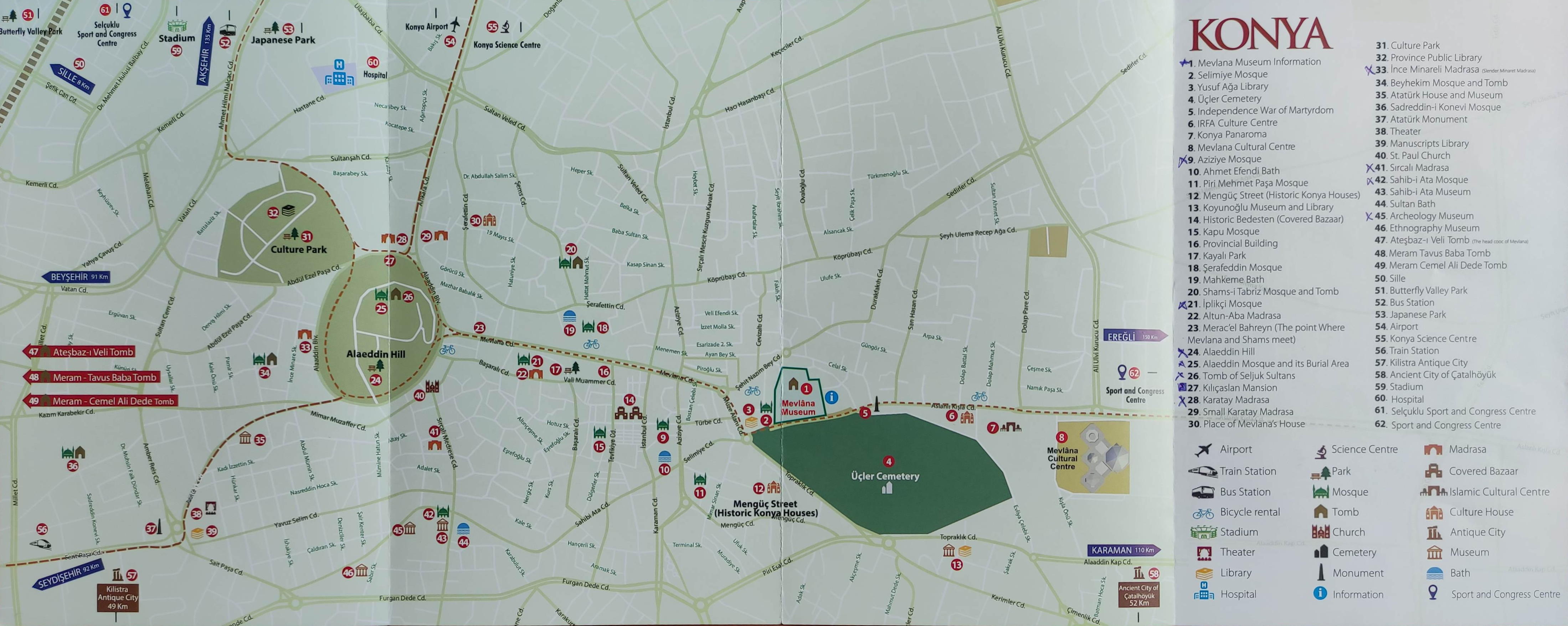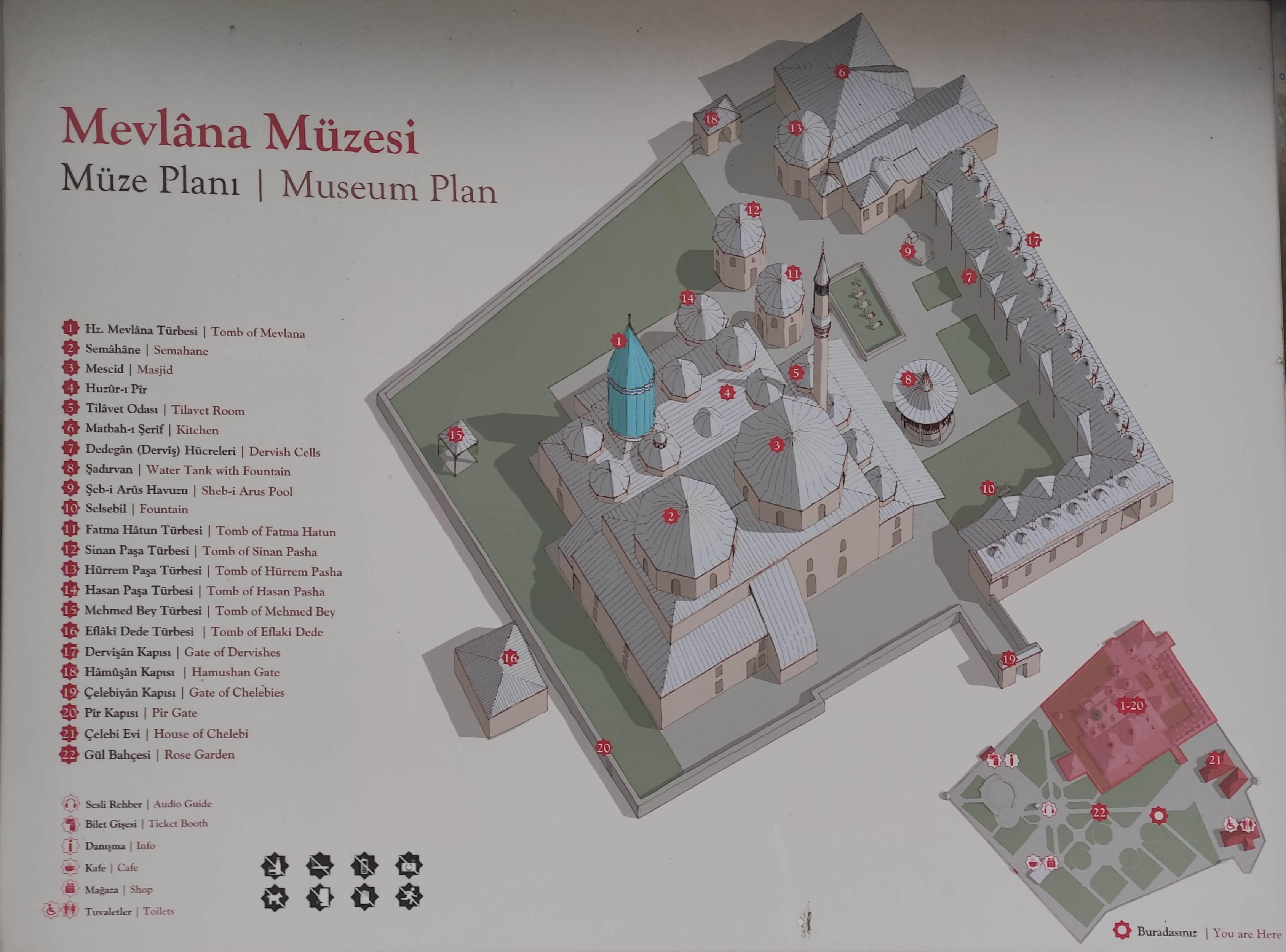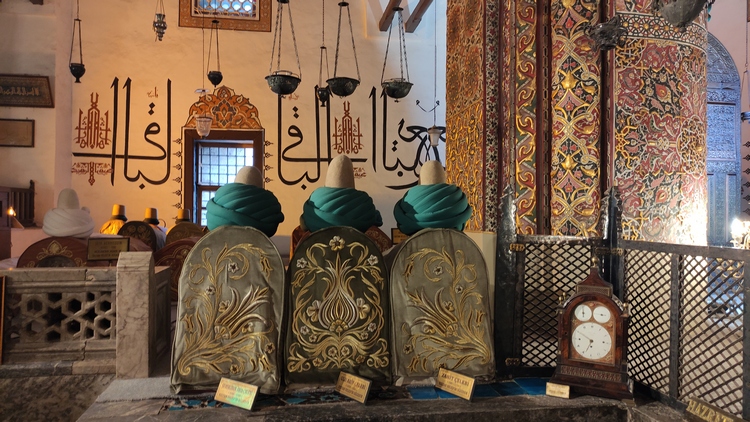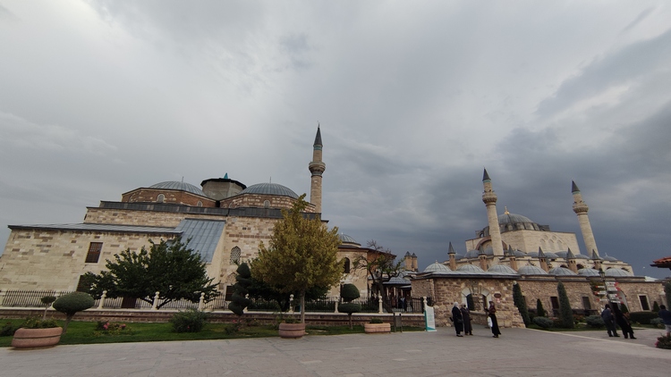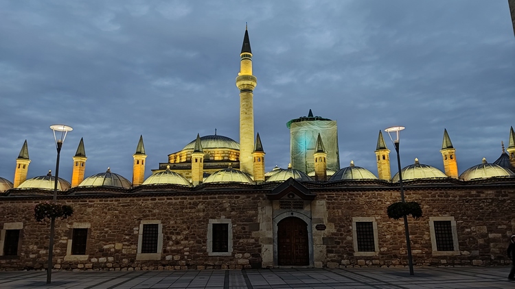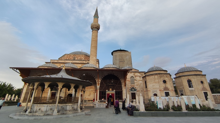 Museo Mevlana. Aquí se encuentra el mausoleo de Mevlana, fundador de la orden sufí conocida como los derviches danzantes. El edificio es fácilmente reconocible por su cúpula decorada con azulejos de un verde intenso, bajo la que está el sarcófago de madera tallada en el siglo XIII, que contiene los restos de santo sufí. En su interior alfombras, tumbas de familiares y discípulos, ejemplares del Corán, caligrafía islámica y mucha devoción. Es un lugar de recogimiento y meditación, donde los numerosos fieles pasan largo rato sentados en el suelo abstraídos.