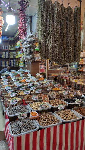Somatçi Fihi Ma Fih. Rango medio alto, al menos en aspiraciones y fama culinaria. Trato exquisito, ambiente agradable, platos muy bien presentados, y carta con sugerencias muy originales. Aunque al final, la comida es correcta, pero no espectacular. Pilaf de trigo con almendras, mixto de carne asada con yogurt, y cazuela de carne con higos, 88 TLR.