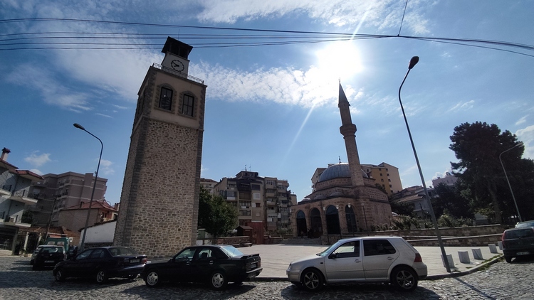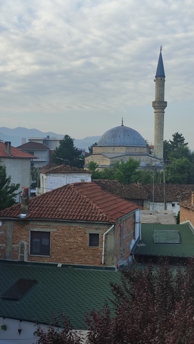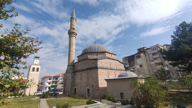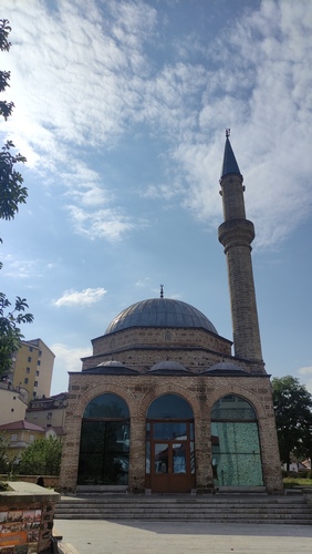 Iljaz Bej Mirahorit, una sencilla mezquita de piedra y ladrillos construida en 1.496. Al final de un bonito boulevard peatonal que nace frente a las puertas de la catedral están el