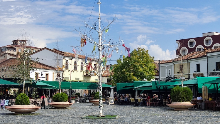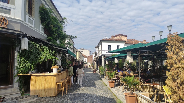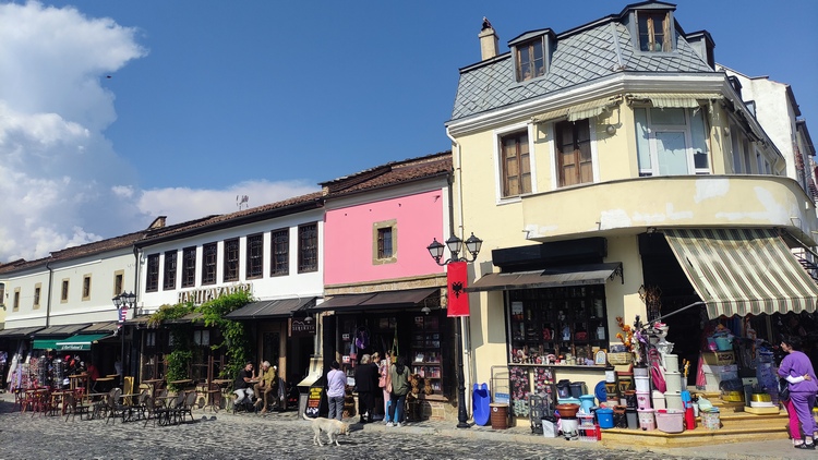 bazar, organizado alrededor de una bonita plaza rodeada de bajas casas de piedra, de la que salen media docena de calles adoquinadas. En la época otomana los artesanos agrupados por gremios atraían comerciantes de todo el imperio. En la actualidad se suceden las terrazas de bares y restaurantes, y las tiendas de souvenirs.