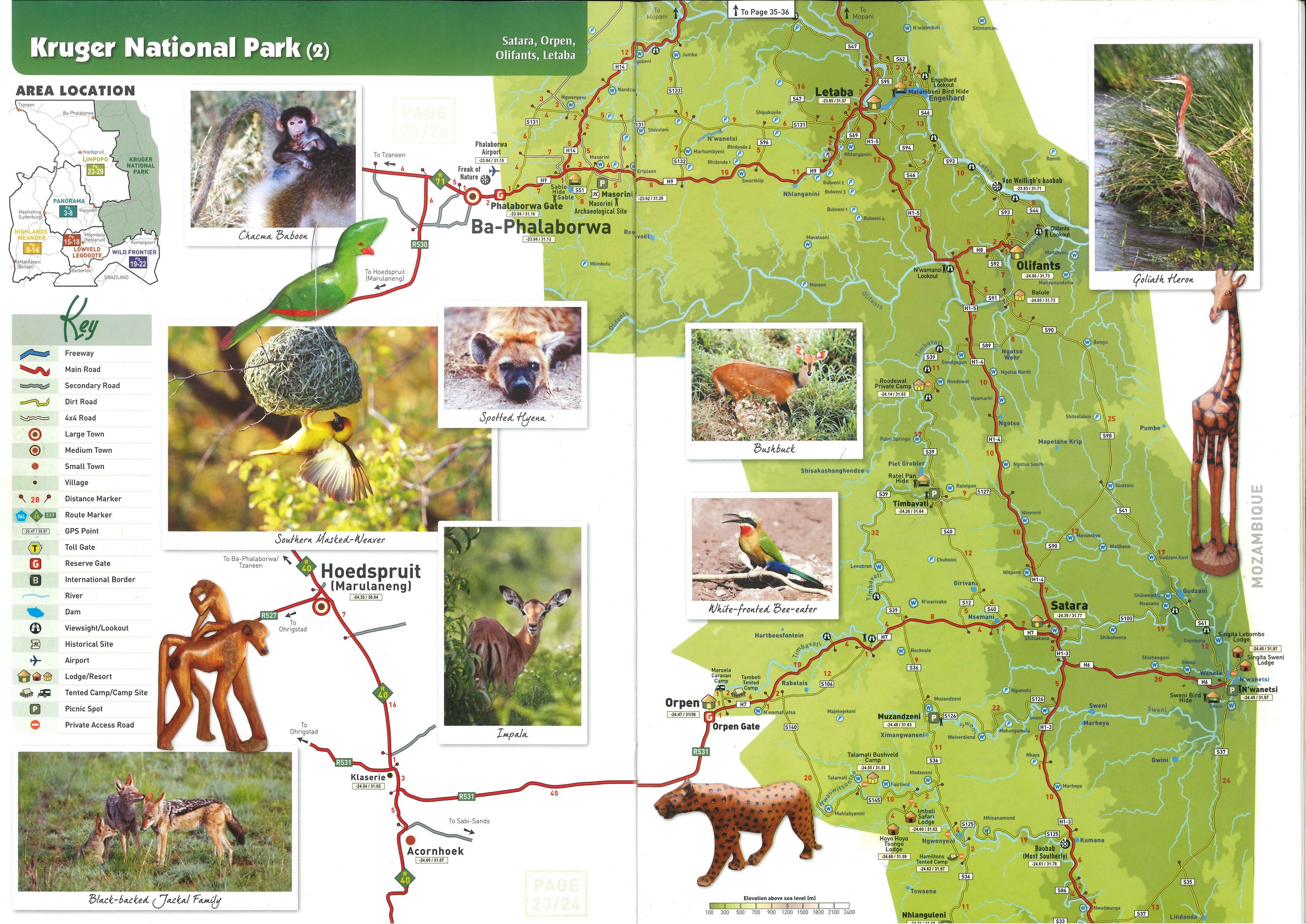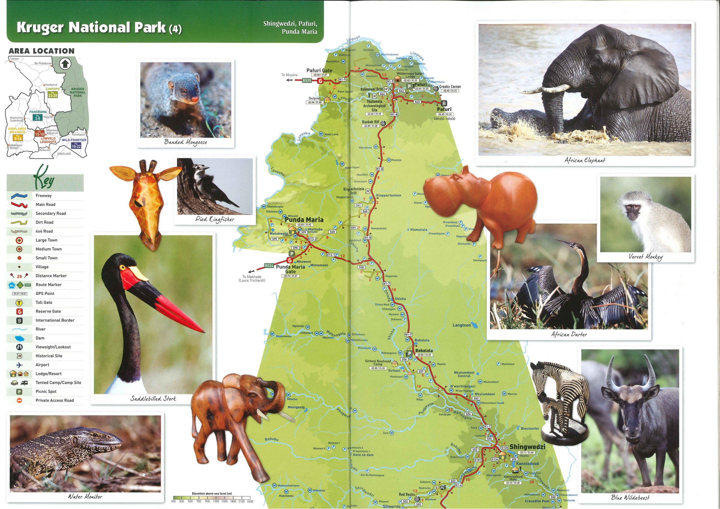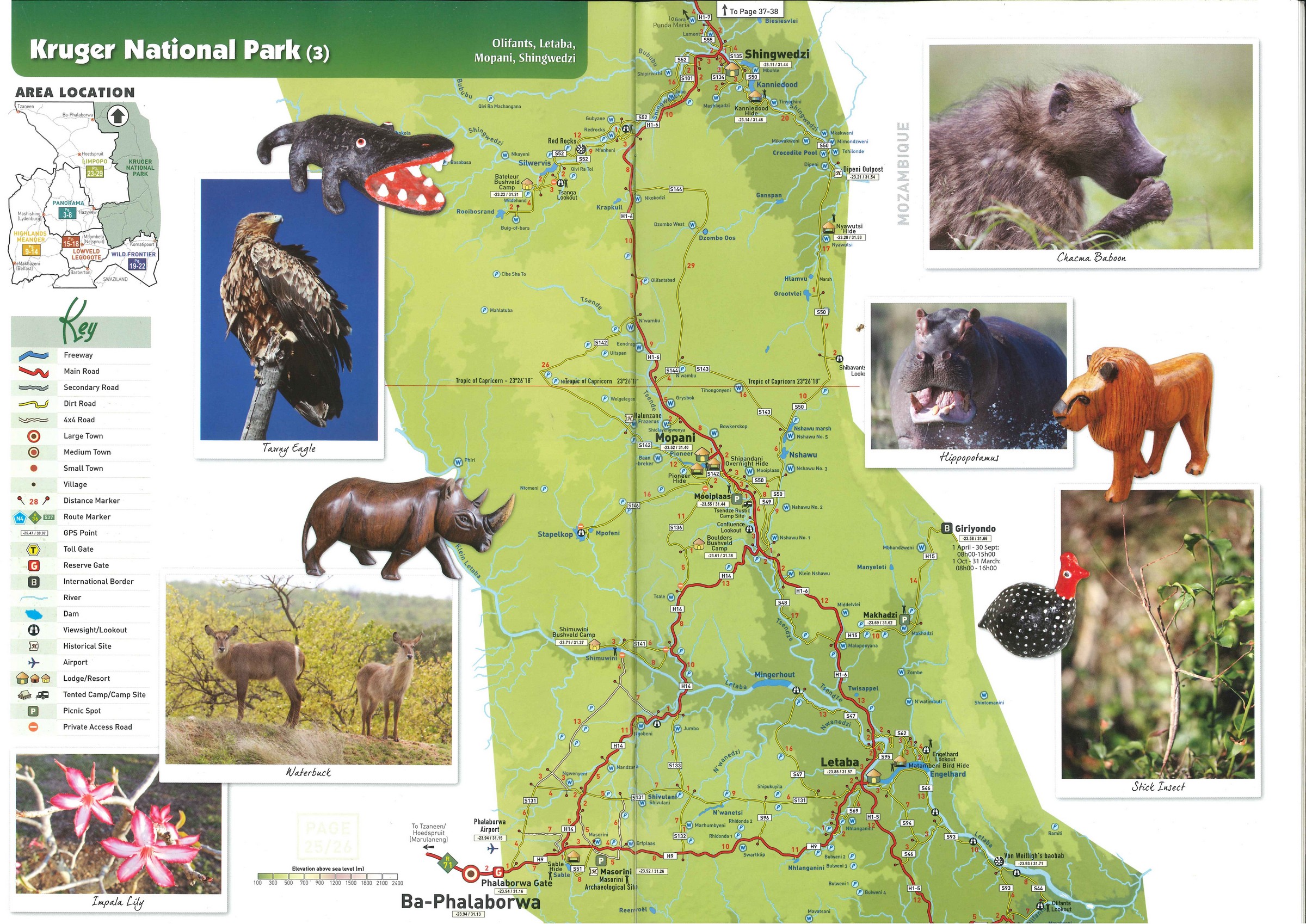 big five (león, leopardo, rinoceronte, búfalo y elefante) y algunas especies endémicas como el licaón (perro salvaje africano), alberga 147 especies de mamíferos, 527 de pájaros, 49 de peces, 34 de anfibios, 114 de reptiles y 336 especies de árboles. Otros puntos de interés son algunos yacimientos arqueológicos y pinturas rupestres esparcidos por el parque. Los paisajes cambien y la distribución de los animales también. Mientras que en la zona sur, más densamente arbolada, se ven algunas pequeñas colinas rocosas, en la zona central la llanura de la sabana se extiende por kilómetros, y cuanto más al norte más dispersa es la vegetación y más árido el terreno. Mapas: