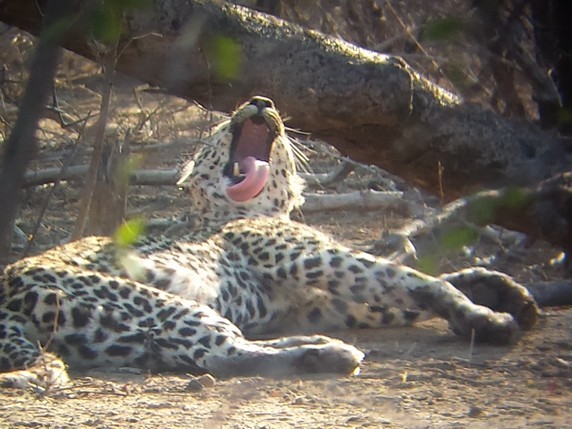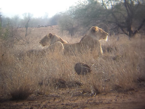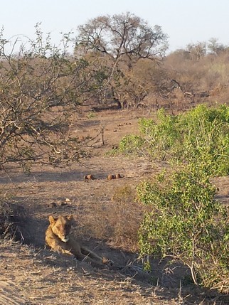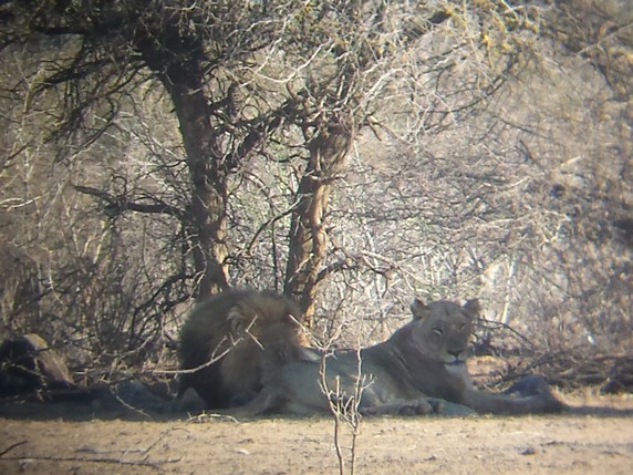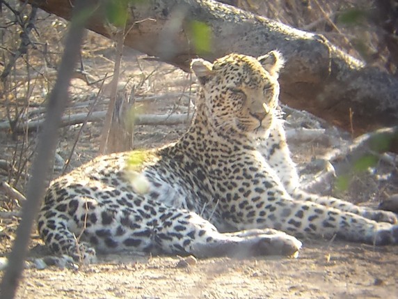 Itinerario. Hoy es otro día variado. Pasaremos media hora con una leona y sus cuatro cachorros, vemos varias familias de elefantes, un leopardo bajo un arbusto a 50 mts, cuatro leones cazando antílopes (intentándolo más bien), un leopardo en lo alto de una roca, dos hienas, tres calaos terrestres sureños (