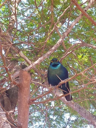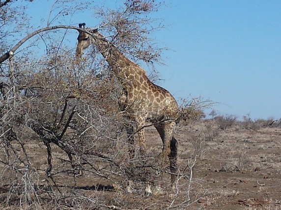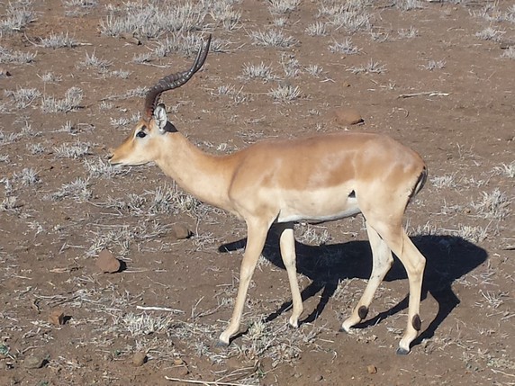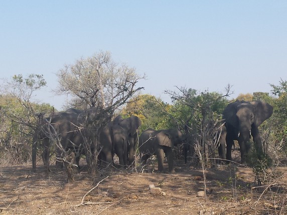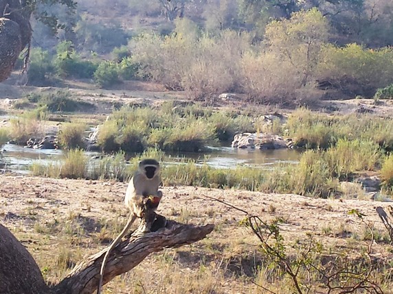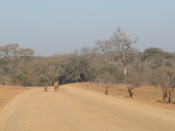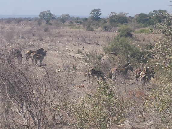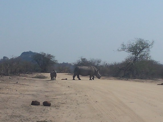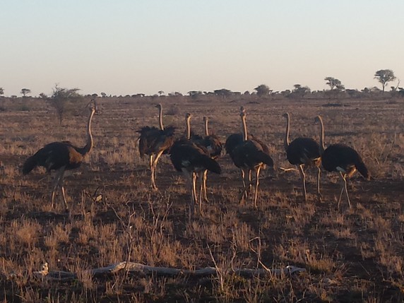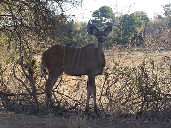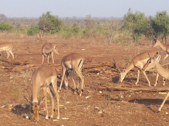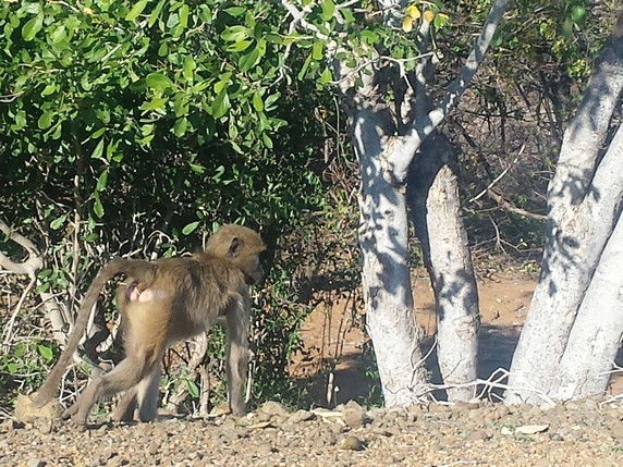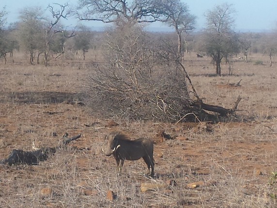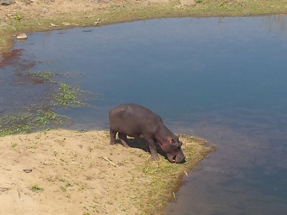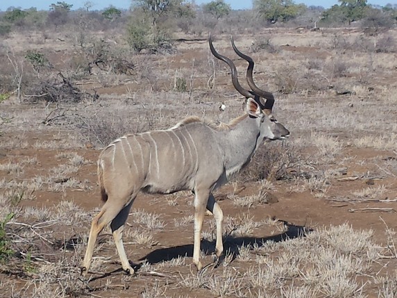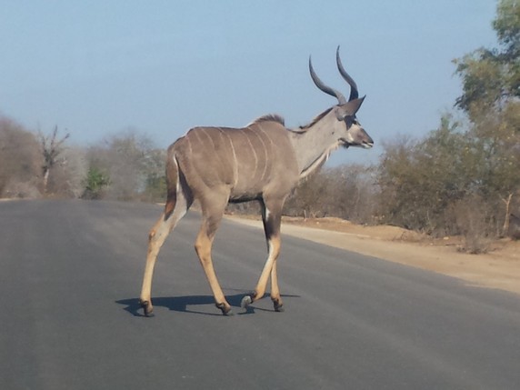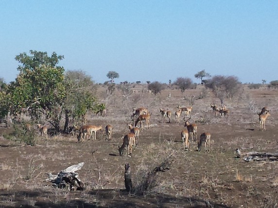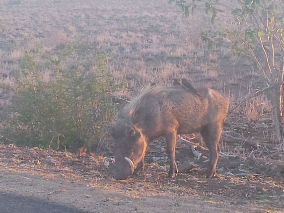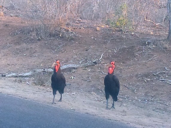 Vemos un tejón de miel, hipopótamos, elefantes, jirafas, facóqueros, cebras, kudús, búfalos, nyalas, antílopes acuáticos (waterbucks), ñus (blue wildebeest), reduncas comunes (common reedbucks), reduncas de montaña (grey rhebuck), bushbucks, impalas, saltarrocas (klipspringer), chacales, cocodrilos, ardillas, búhos (african scops owl), buitres, avestruces, calao terrestre sureño (southern ground hornbill), tocos piquinegros (african grey hornbill), estorninos de El Cabo (cape glossy starling), cercopitecos verdes (vervet monkey), babuinos, cormoranes, acacias, baobabs… Un día cualquiera en Kruger, increíble.