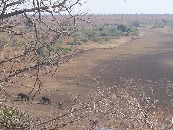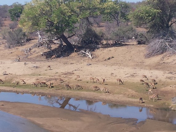 A pesar de la elevadas temperaturas, durante las horas centrales del día se ven algunos animales bebiendo en las pocas charcas con agua que quedan al final de la temporada seca, seguramente porque saben que los carnívoros no se moverán a esas horas.