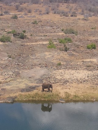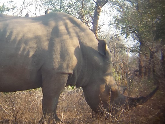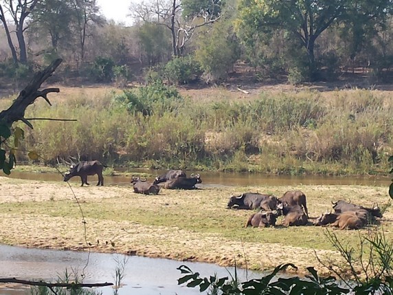 southern ground hornbill), y bebiendo en la charca de Renosterkoppies un rinoceronte con su cría, una jirafa y un buen grupo de impalas. Volvemos a Skukuza. Desde la terraza del restaurante se ve una manada de búfalos al otro lado del río, echándose la siesta.