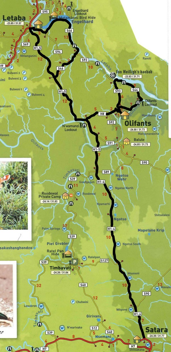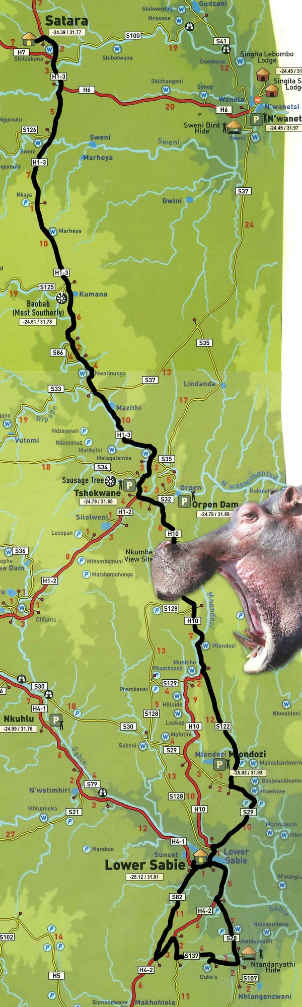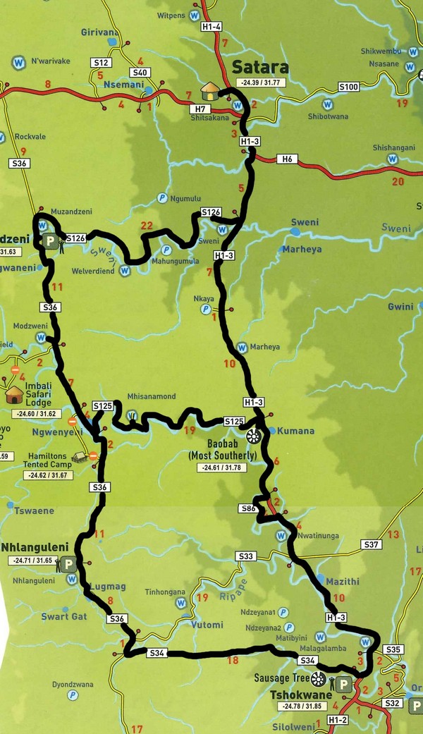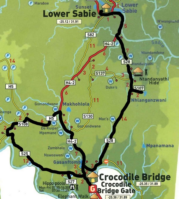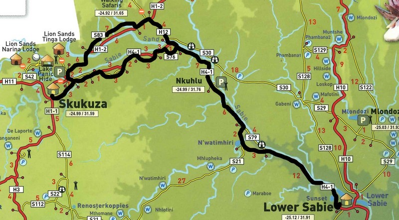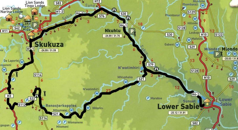 Itinerario. Durante nuestra estancia en Kruger (septiembre), amanece a las 05h30. Los campamentos están abiertos de 06h a 18h, fuera de esas horas no se puede entrar ni salir. Si quieres ver animales, sobre todo carnívoros grandes, el momento ideal es entre 06h y 09h30-10h, y por la tarde de 16h30 a 18h, el resto del día la temperatura es muy elevada y los animales se cobijan bajo las sombras de árboles y arbustos, siendo mucho más difíciles de localizar. Eso lo aprendimos el primer día, cuando salimos del campamento a las 09h. A pesar de todo vimos una buena cantidad de animales.
