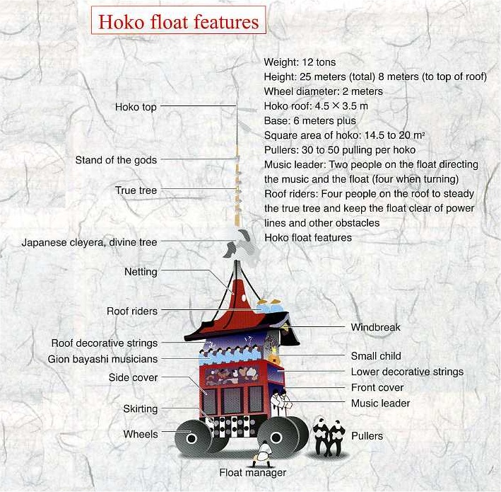 hoko) son tiradas con cuerdas por unas 50 personas, llegan a pesar 15 toneladas y alcanzan 25 metros de altura. En los cruces ponen en el suelo cañas de bambú bajo las ruedas delanteras, engarzan las ruedas con cuerdas y desde el extremo contrario tiran de ellas mientras otros empujan la rueda. Un giro de 90º requiere tres empujes al menos, que llevan unos diez minutos. Cada empujón es coreado por gritos de ánimo y admiración del numeroso público que abarrota las calles. Son estructuras de dos plantas. Un par de personas en el tejado mantienen el paso limpio de cables eléctricos, la segunda planta la ocupan una veintena de músicos campanilleros, y al frente un par se encargan de dar las ordenes a los arrastreros. Ambas