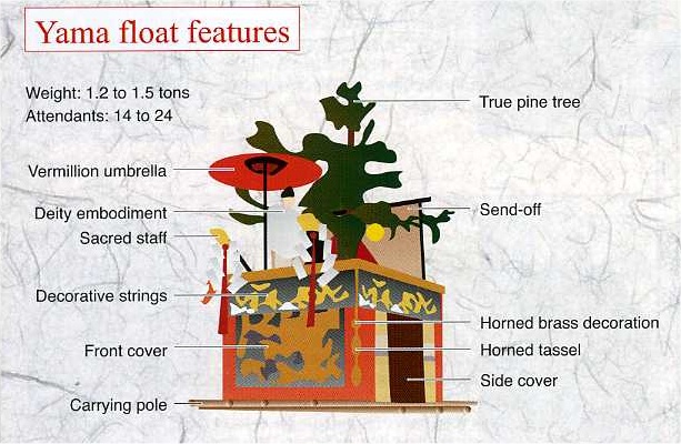 yama) son como las de la Semana Santa española, pesan unos 1.500 kg y son arrastradas por unas 20 personas. En los tramos rectos son empujadas por ruedas de madera que van escondidas bajo la decoración, y en los cruces giran a hombros de los asistentes. En lo alto suelen llevar un pino y una sombrilla que cobija la deidad. Las grandes (
