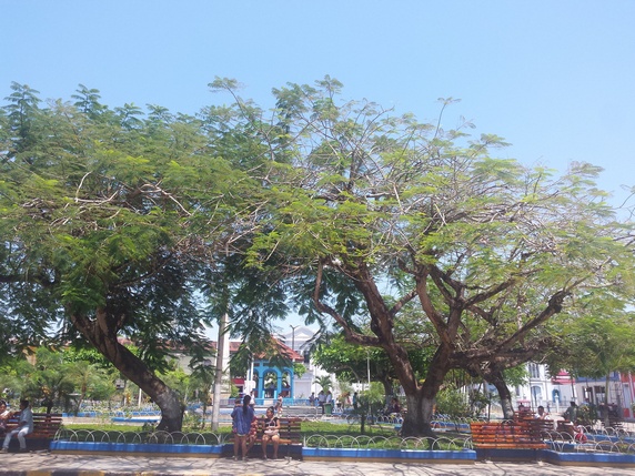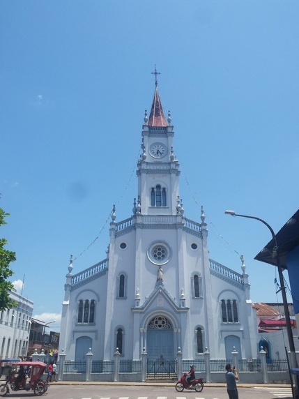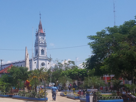 Plaza de Armas, un enorme espacio lleno de árboles y bancos donde sentarse, rodeado de edificios construidos durante la época del virreinato. La vista se desvía inmediatamente hacia la Catedral de la Virgen de las Nieves, una iglesia con una enorme torre central, que parece desproporcionado con el tamaño del pueblo. Pasamos por el hotel