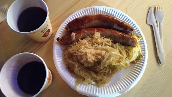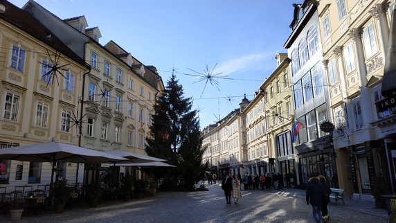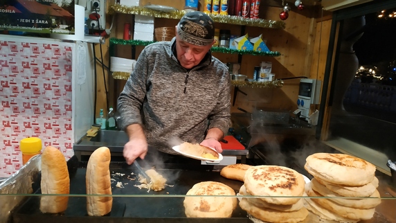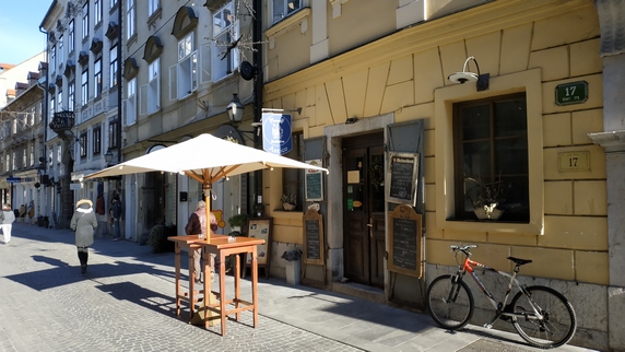 Para comer es ideal la Plaza Vodnik, hay puestos ambulantes de comida y está rodeada de bares y restaurantes. Por la noche cierran, y los puestos ambulantes se trasladan a los alrededores de Plaza Preseren, y en ambos lados del río los restaurantes sacan las estufas a la calle. Probamos aquí y allá, salchicha eslovena acompañada de col en vinagre, copa de vino y vino caliente, 10€; y estofado de pollo con verduras y pan, 7€. Postre en
