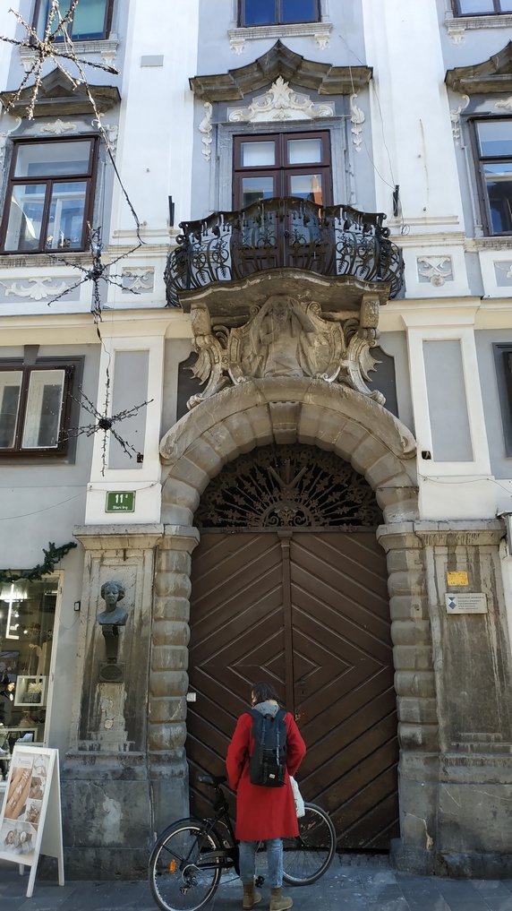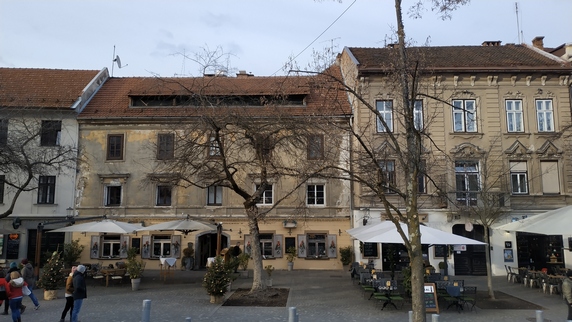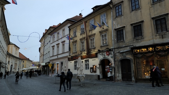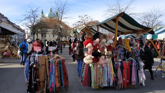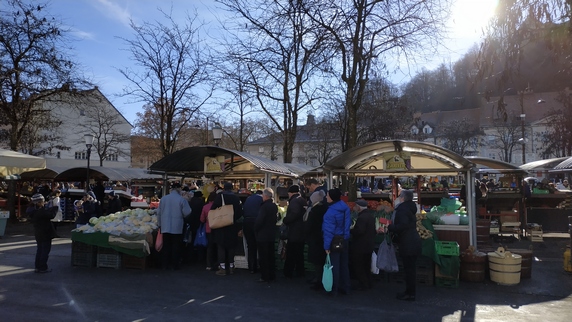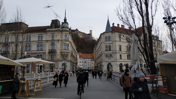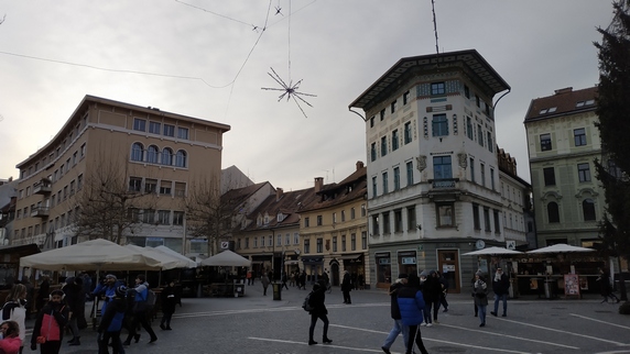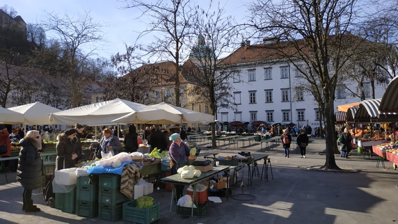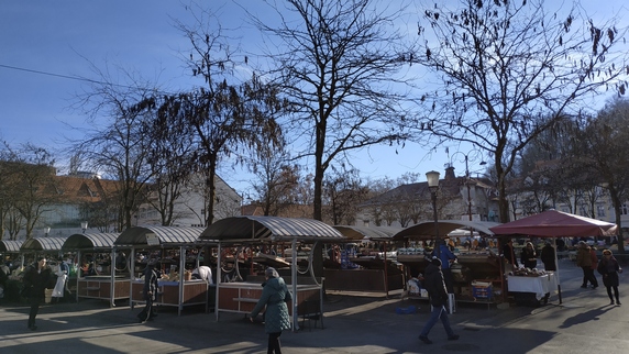 plaza Vodnik, que ocupa el espacio de un antiguo monasterio destruido por un terremoto en 1895. Actualmente alberga un mercado al aire libre, donde se vende fruta (sobre todo manzanas y caquis), verduras (mucho chucrut y nabos), ropa y calzado; y el edificio del Mercado Central donde se encuentra carne, embutidos y pan, no vimos pescado. Paralela al río hay una bella columnata donde hay algunos bares y restaurantes, al otro lado la estatua de Valentín Vodnik, escritor del siglo XVIII.