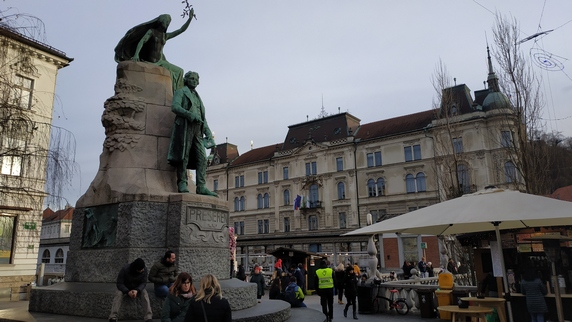 Plaza Preseren, presidida por una estatua en honor a France Preseren, considerado el mayor poeta esloveno. La estatua mira hacia un relieve de mujer en la fachada de una casa en la calle Wolfova, su gran amor no correspondido, Julia Primic. El edificio más llamativo, sin duda, es la iglesia de la Anunciación de María, un edificio barroco pintado en color rosa pastel. Pero el más peculiar es el