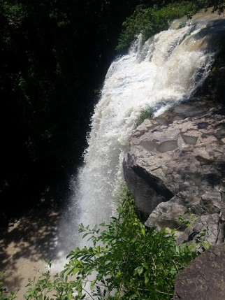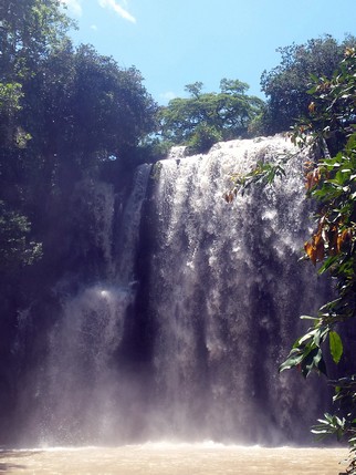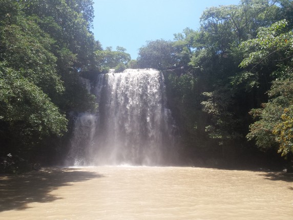 Tras remojarnos aquí un buen rato, caminamos 200 mts por un sendero a través del denso bosque tropical, que lleva hasta la playa que queda frente a la cascada principal. La catarata, de unos 30 mts de altura por 50 mts de ancho, está alimentada por el río Potrero. Al ser temporada de lluvias está en su plenitud, el agua forma una cortina que en su caída crea una enorme piscina apta para el baño, aunque debido al fondo arenoso es marrón y poco transparente. Frente a la catarata se ha formado una playita de arenas claras en la que hay un pequeño chiringuito donde venden carnes a la brasa, refrescos y pipas frías.