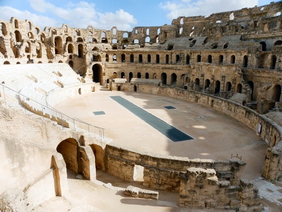 coliseo, el testimonio mas importante de la antigua ciudad púnica de Thysdrus, convertida en colonia romana a mediados del siglo III. Construido entre 230 y 238 es el tercero mas grande del mundo y la reliquia romana mejor conservada de África. Tiene unas dimensiones de 138 por 114 metros y una capacidad de mas de 30.000 espectadores. Los corredores conducen a todos los niveles del auditorio, y dos largos pasillos subterráneos permiten acceder a la zona donde aguardaban fieras, gladiadores y demas victimas de la barbarie antes de salir a la arena. La vista desde las gradas superiores es impresionante. El