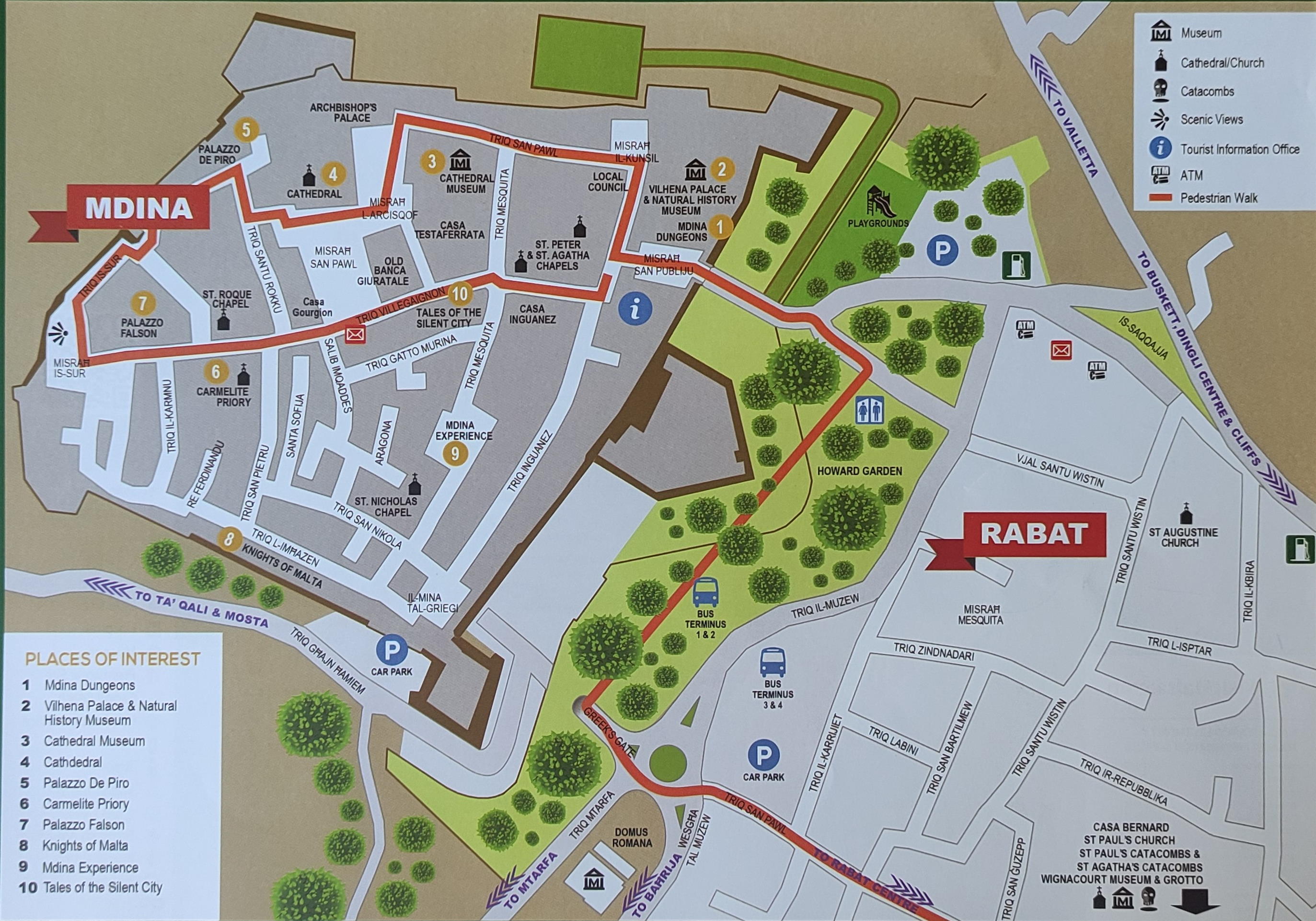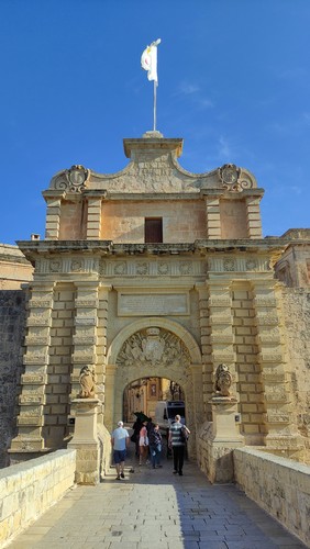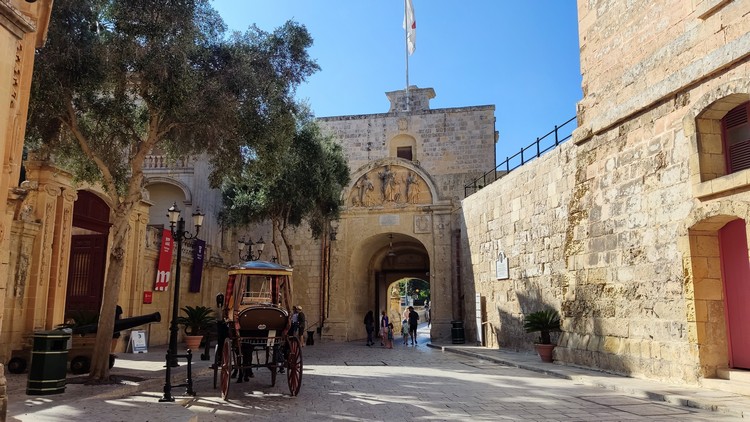 Mdina es un museo al aire libre, magníficos palacios medievales, edificios renacentistas, iglesias, todo ello rodeado por una muralla y foso construido por los árabes, quienes la habitaron tras griegos, romanos y fenicios. Fue capital de la isla hasta la llegada de los caballeros de San Juan en 1530. La puerto de acceso principal de la muralla esta flanqueada por dos leones y coronado por un escudo de armas. En su interior lo primero que encuentras son tres estatuas con los patrones de la ciudad, el Palazzo Vihena de estilo barroco, la Torre del Estandarte, la Catedral de San Pablo, construida en el lugar donde el apóstol convirtió al cristianismo al gobernador romano de la época, el Palazzo Falzon, el Palazzo de Piro, y un sinfín más escondidos entre callejones y plazas. Tampoco faltan jardines y maravillosas vistas desde lo alto de las murallas. En la parte de