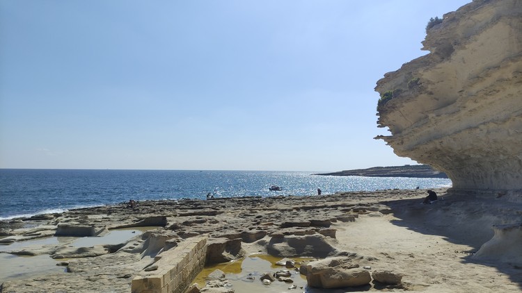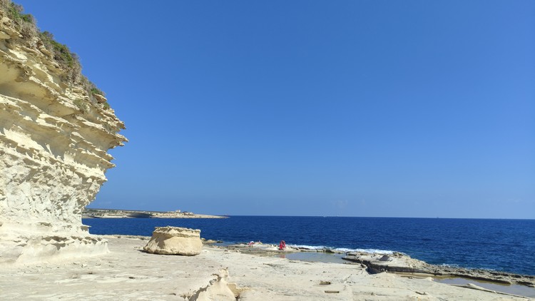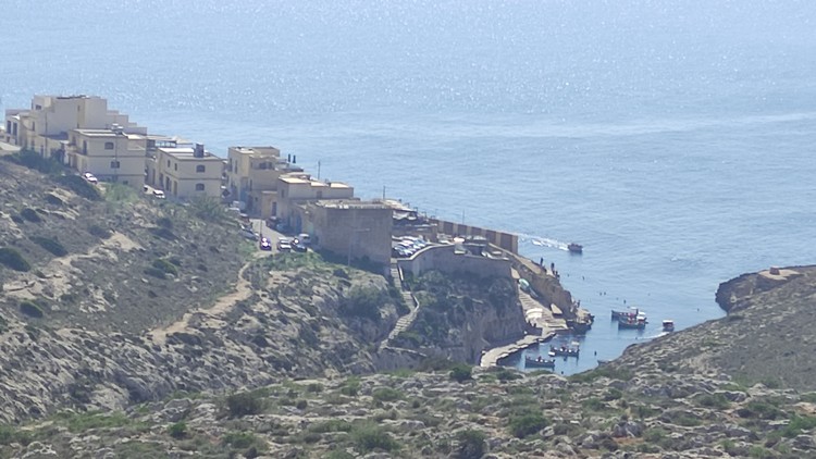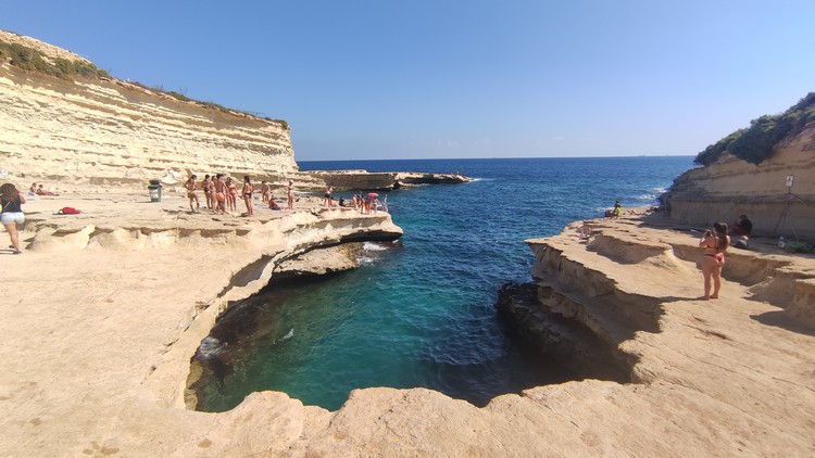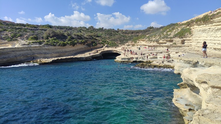 Marsaxlook, es accesible después de un camino de tierra de unos 600 mts donde solo cabe un coche, que acaba en un parking, 3€ todo el día. Después hay que caminar unos 300 mts. La ensenada esta toda ella rodeada de roca, llena de gente, no hay barcos fondeados, no caben, no existen chiringuitos, ni duchas, ni ningún otro servicio más que unas pequeñas escaleras que te ayudaran a entrar y salir del agua. Las vistas son impresionantes, tanto del mar como de los acantilados que la rodean. A pesar de estar lleno de gente, es una buena zona de baño.